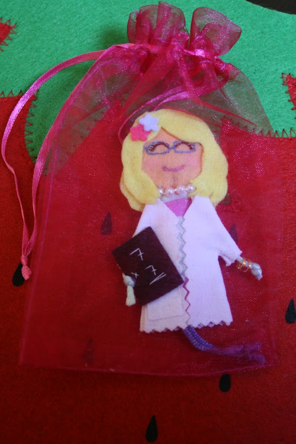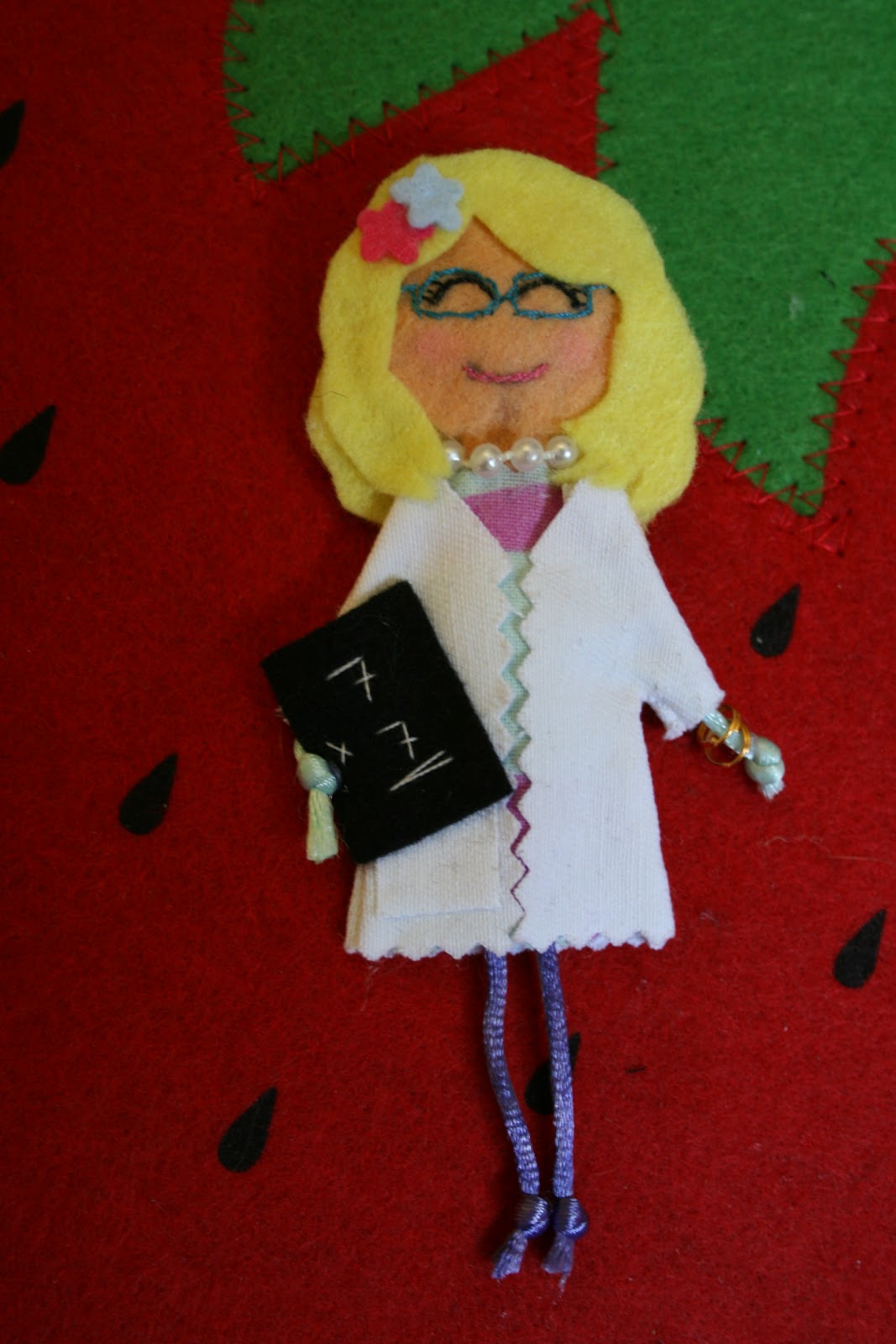 Una profesora de matemáticas (ya retirada) va a recibir este broche, encargo de su nuera. En fieltro, tela (bata blanca y vestido), cola de ratón y carita cosita. Con sus pulseritas, gafitas y su pizarrita con la multiplicación