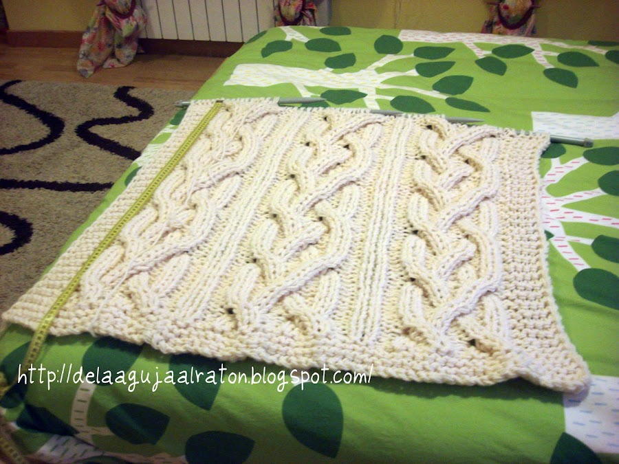 En la foto se aprecian los bordes a Punto Bobo/Punto Musgo/Punto Santa Clara y lo bonito que queda el Punto Ondas. Que no os asusten tantos agujeros ya que abriga un montón y se hace en un pis pas. Materiales: 4 ovillos de lana color crudo con pelito para trabajar con agujas 7/8 6 ovillos de lana color gris con pelito para trabajar con agujas 7/8 un par de agujas nº 10 aguja lanera Punto empleado: ...