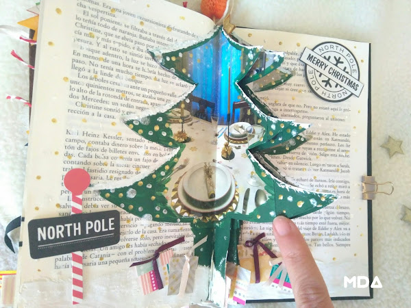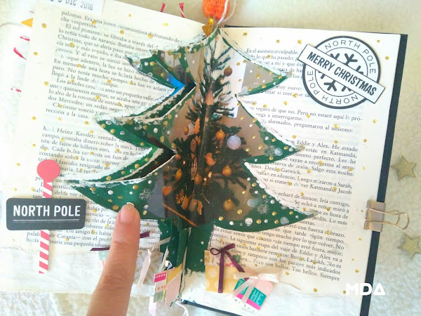 El tema propuesto no podía ser otro que las Fiestas de Navidad, así que con el álbol como elemento central y a modo de pop up, he incluido tres fotografías de estos días: la mesa de Noche Buena, nosotros el día de Navidad y el álbol que decora el salón.