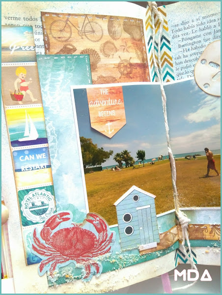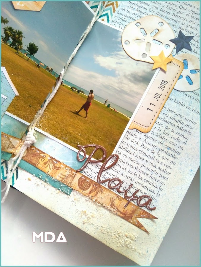 Tonos azules y ocres que combinan con la fotografía además de la palabra "playa" troquelada con un alfabeto de La Pareja Creativa en la Big Shot.