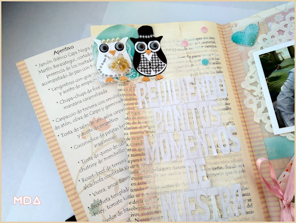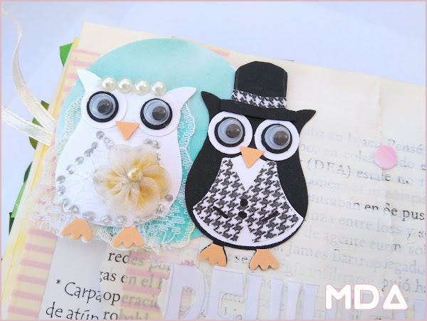 En el borde superior izquierdo, dos búhos vestidos de novios dan el toque simpático al trabajo y que han sido troquelados con un Owl Punch de Gargamell Scrap