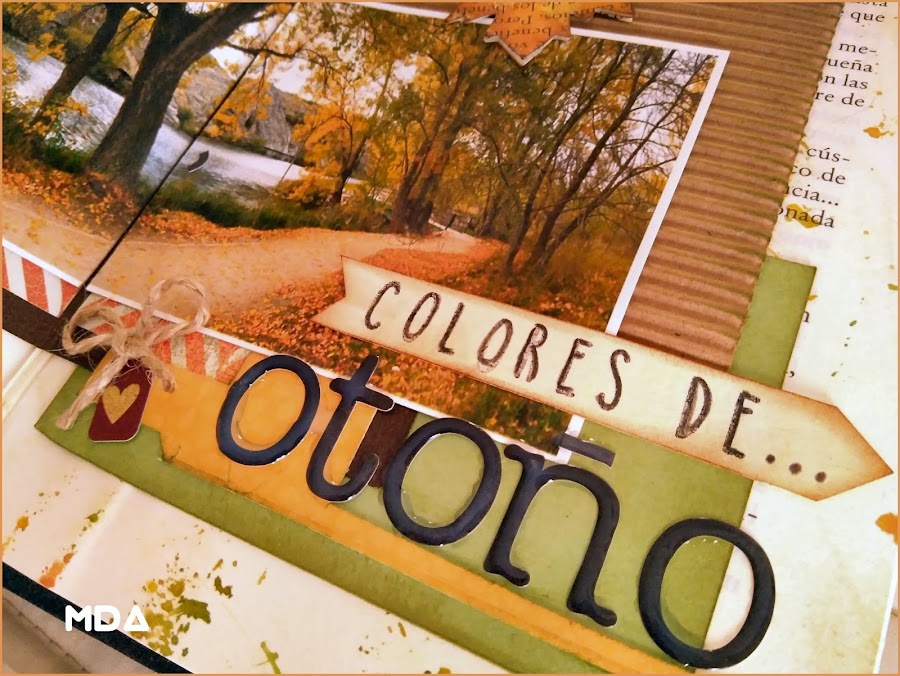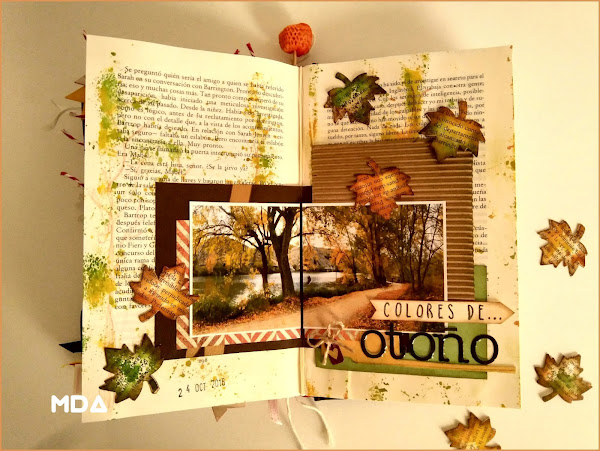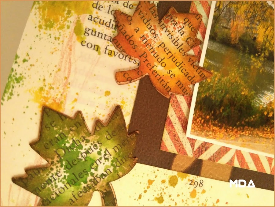 Un fondo con distintos tonos de distress y agua para emular los chopos de la ribera del Duero donde ha sido tomada la fotografía, distintas tonalidades y texturas para los papeles que la enmarcan y una hojas troqueladas de las mismas hojas del libro (aquellas que me sobran) entintadas con los mismos tonos son todos los elementos que he usado para estas páginas.
