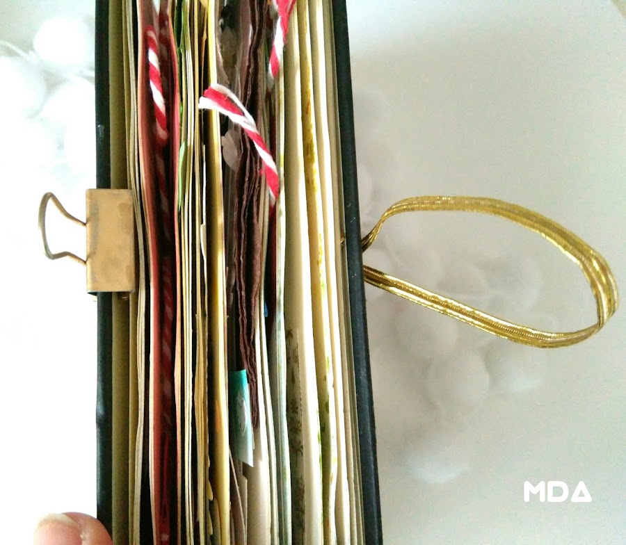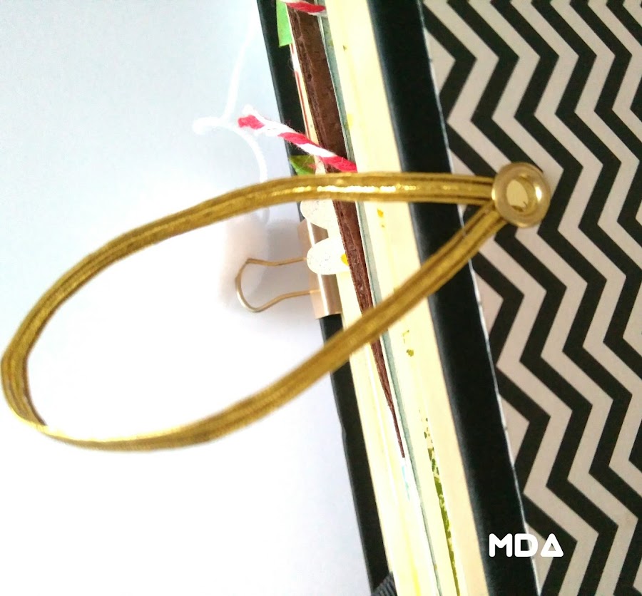 El cierre consiste en un poco de goma elástica dorada sujeta a la tapa trasera con un eyelet que al pasar por una pinza dorada colocada en la tapa de delante permite el cierre de mi Project Book.