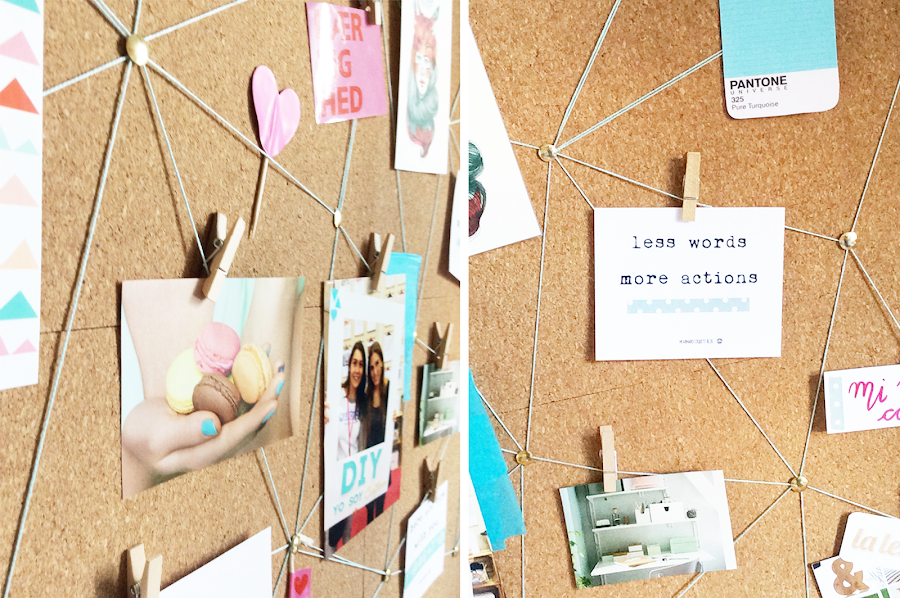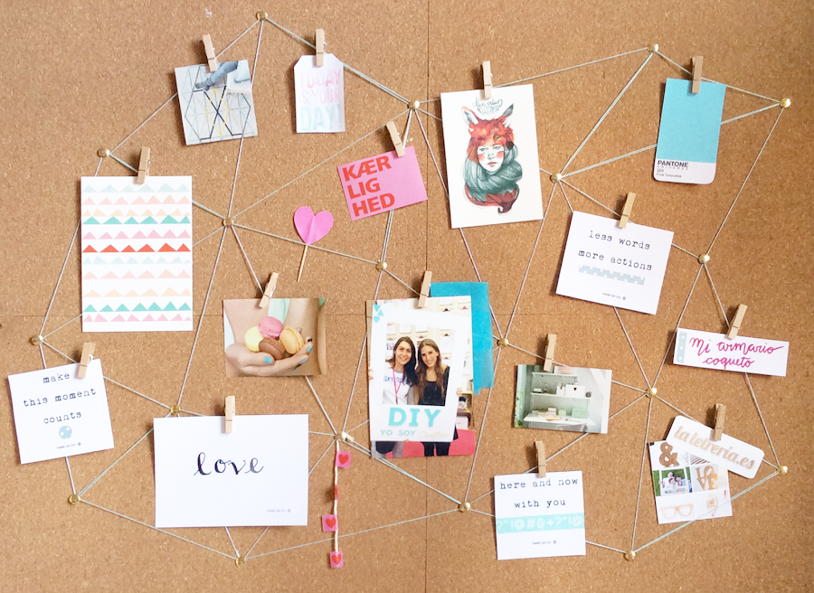 Lo único que hay que hacer es pinchar las chinchetas de forma más o menos aleatoria en la pared (o sobre corcho, como he hecho yo) y después unirlas con el cordel. Ya tenemos listo nuestro tablero. Ahora sólo hace falta llenarlo con fotos y postales que nos inspiren diferentes sensaciones.