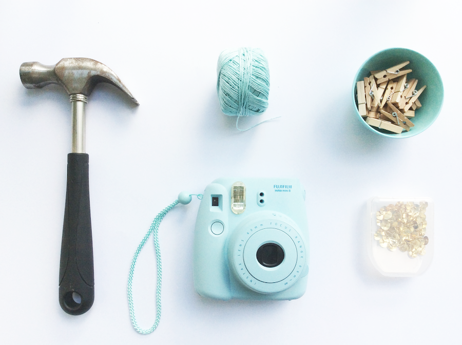 Lo que necesitamos es: cordel, chinchetas y martillo para construir el tablero; y pincitas de madera más láminas y fotos para aportar la inspiración.