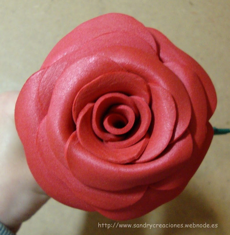 Con este último paso la rosa estaría terminada, el tamaño usado así como la forma son orientativos, según lo que tengamos pensado hacer, necesitaremos rosas más grandes o más pequeñas, más abiertas o más cerradas, pero los pasos a seguir serían básicamente los mismos y lo único que variaría seria la Pasta Polimérica necesaria y la medida de los moldes. En nuestro caso la rosa resultante ha sido de 2cm de diámetro y 1cm de altura.