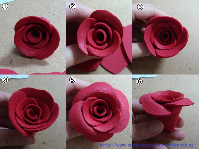 Primero los tres trozos más pequeños (Paso 4) y luego vamos poniendo los nueve trozos más grandes, siempre guiándonos por el esquema de arriba. A medida que vamos uniéndolos se puede ir dando forma a nuestro gusto, dándole un aspecto más abierto o más cerrado a la rosa. Una vez colocados todos los pétalos a nuestro gusto, podemos pulir la base de la rosa, cortándola con cuidado con cúter para que quede plana.