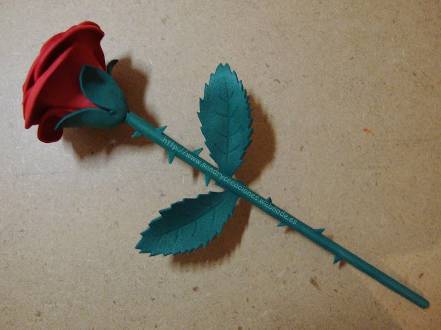 Finalmente nos quedará adornar el palito de la rosa con dos hojas (patrones nº 6 y 7 ) y si queremos ponerle pinchos podemos recortar y pegar triangulitos pequeños de foamy o goma eva verde a lo largo del palito. Podemos utilizar el palillo o mondadientes para marcar las líneas de la hojas.