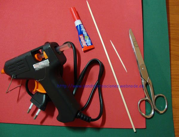 Para hacer el palo cogemos un palito de madera tipo pincho moruno o de otro tipo, de la medida que queramos (en nuestro caso la medida del palito es 25cm de longitud) y cortamos un trozo de foamy o goma eva verde de la misma medida que el palo teniendo en cuenta que lo podamos cubrir todo. A medida que vamos enrollando el palito con la goma eva o foamy lo vamos pegando. Para hacerlo podéis utilizar silicona caliente o pegamento instantáneo de gel, eso sí, si utilizais este último mucho cuidadito con pegaros los dedos.