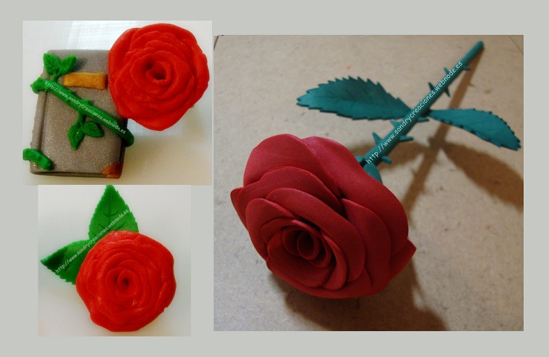 Como ejemplos de lo que hemos hecho en SanDryCreaciones con las rosas de Pasta Polimérica: un imperdible donde la rosa envuelve con el tallo a un libro (en este caso mezclamos Fimo para realizar la rosa y el tallo, con Sculpey para realizar el libro y sus detalles) o bien, un ejemplo más sencillo, un bonito colgante, donde hemos añadido a la rosa un par de hojas y hemos agujereado la base de la rosa con una aguja antes de hornear para poder realizar el colgante.