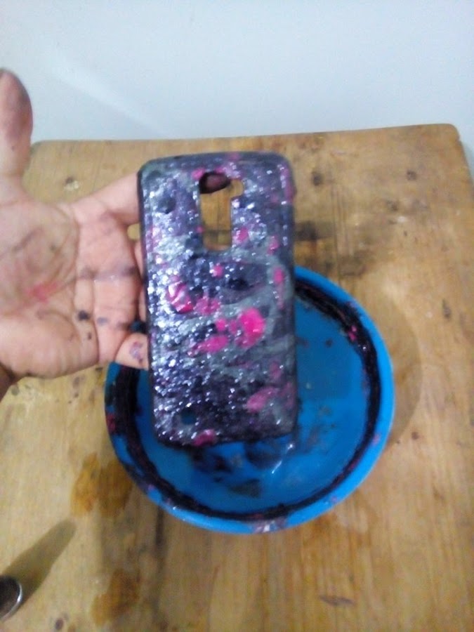 Yo quise hacer mi protector de galaxia, así que use pinturas con glitter, de color negro, rosa, morado y blanco. Tú puedes usar los colores que más te gusten.