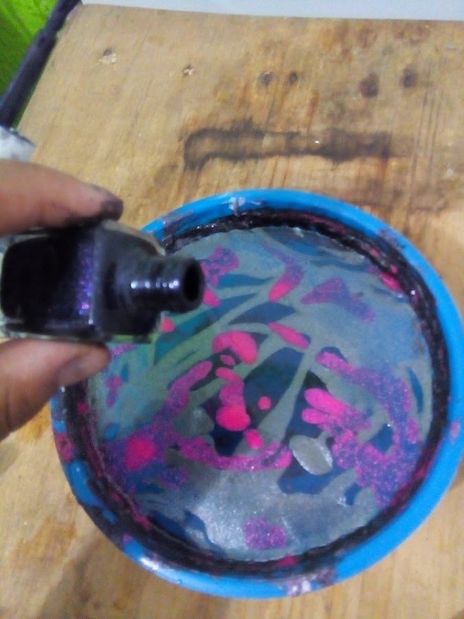 Con cuidado mueve tu recipiente en círculos para que el esmalte se expanda y se mezcle un poco con el movimiento del agua
