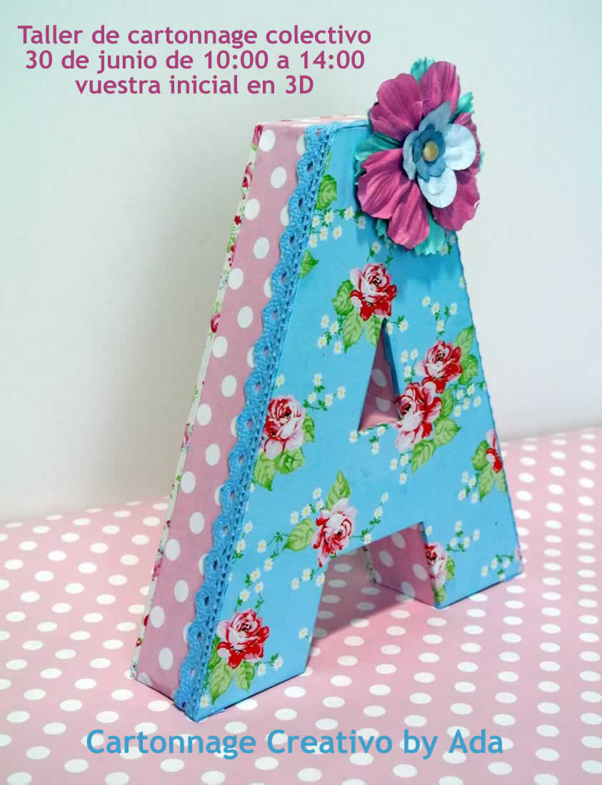 Haremos una letra grande en 3D partiendo de nada. Aprenderás a cortar el cartón, a medir, a utilizar y conocer las herramientas necesarias, a forrar con papel/tela, podrás decorarla a tu gusto, conocerás y veras todas las posibilidades que tiene la técnica del cartonaje y además TE LLEVARÁS UN KIT COMPLETO PARA QUE PRACTIQUES EN CASA.