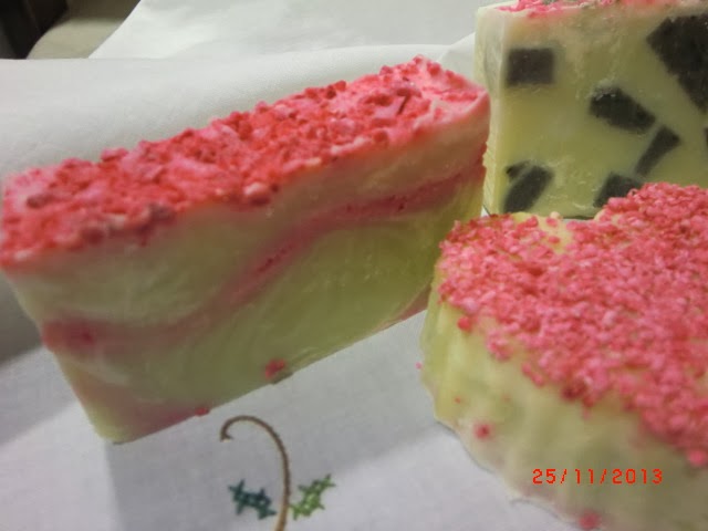 Me pasé un poco con la manteca de cacao porque el aceite de rosa mosqueta es bastante delicado y se estropea con facilidad sin conservantes y para equilibrar el yodo fui poniendo y poniendo y supongo que me pasé...los que entienden de ésto seguro que me entienden; añadido al frío inusual que hizo esos días se enfrió demasiado rápido y en el momento de desmoldar no se cortaba bien, pero me guardé igual unas cuantas piezas porque me parecen chulas igualmente. Y con el resto, decidí jugar un poquito.