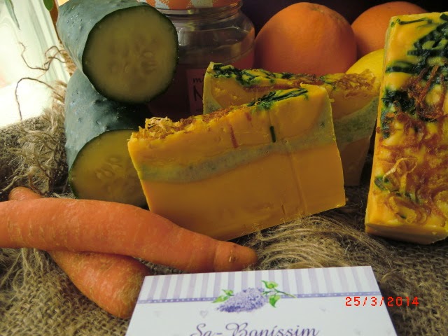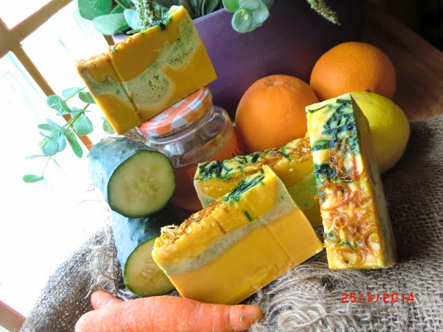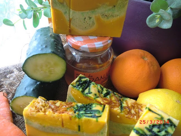 ¿Sabéis de esas bebidas de zumos comercialmente sanos (supuestamente) ? Sí, esos que llevan zumo de naranja, manzana, limón, zanahoria... pues este jabón lleva casi todos esos ingredientes: naranja, limón, zanahoria...y pepino! Con un extra de miel de naranjo! En este caso, todo natural, nada de zumos comerciales añadidos ;)
