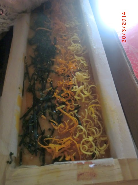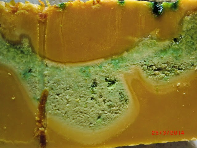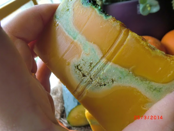 Como era de esperar, el pepino aportó mucha agua y aunque desconté del agua base, necesitará más tiempo de secado, espero que evapore y bien. Fijaos en la zona verde del medio, donde mezclé el pepino infusionado con el jabón y su piel rallada escaldada.