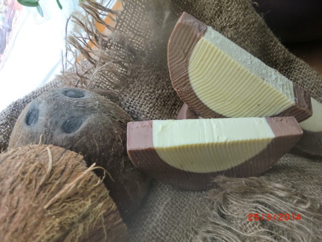 Aparte del aceite de coco que no falta en mis jabones, lleva esa esencia aromática a coco y como no, coco rallado a "tutti pleni".