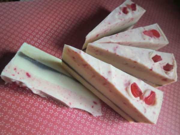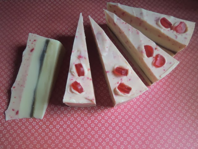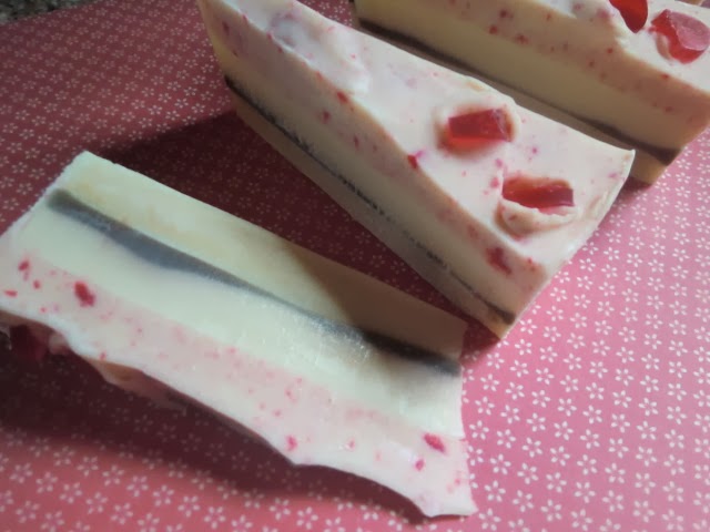 Ciertamente me olvidé de añadir las fresas de verdad pero para asegurar que hubiera moteado rojo simulando fresas usé virutas de jabón teñido de rojo y barritas de glicerina en rojo a rodajitas para la decoración superior. Huele a frangipani, una flor exótica deliciosa.