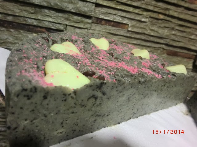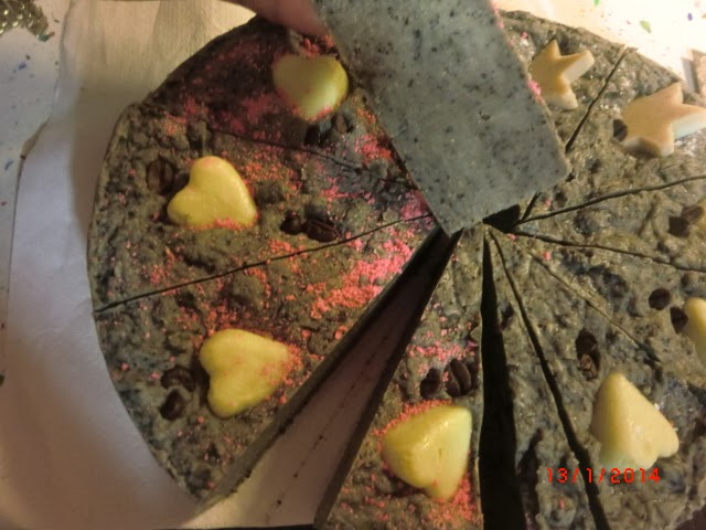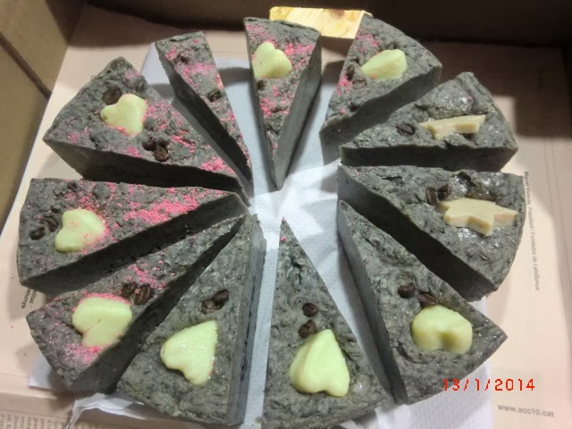 Yo, que soy una pesada con mis cavilaciones y le doy al coco un montón, demasiado, estaba decorando la tarta con virutas rosa cuando pensé que a lo mejor habría algún chico o señor que le gustaría exfoliarse las células muertas de su body también....y para que no se corte al parecer un jabón para féminas, pues dejé media tarta con azúcar glacé, blanquito, que el jabón absorbió como era de esperar pero no esperaba tanto! jaja... El jaboneo es sorprendente en cada ocasión...