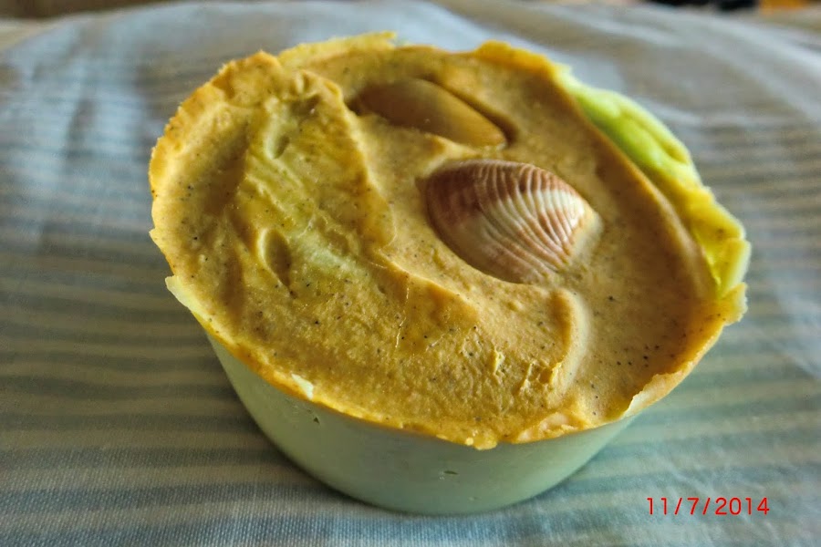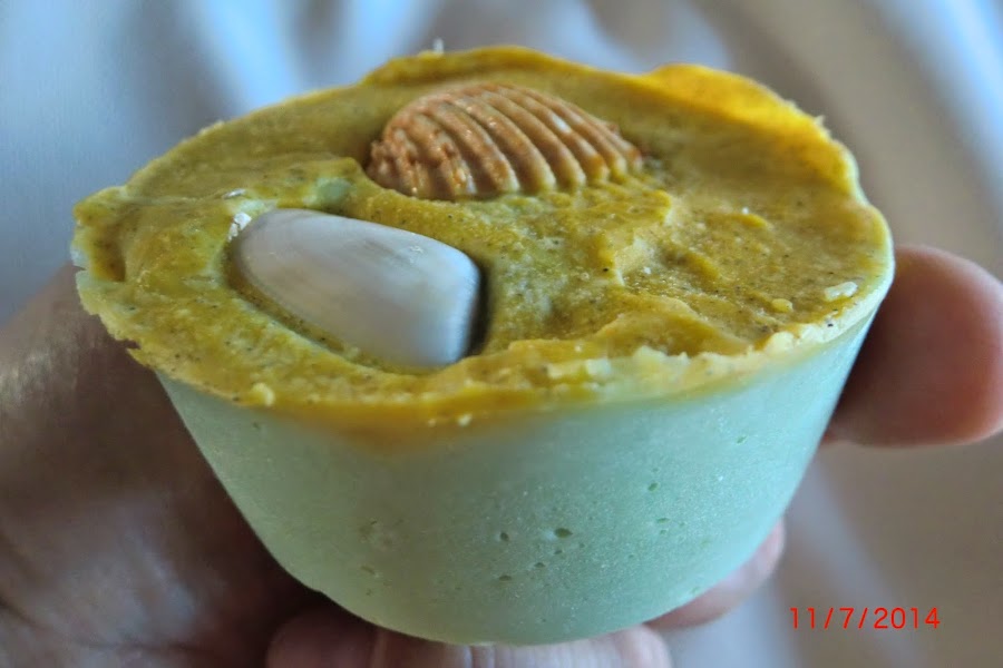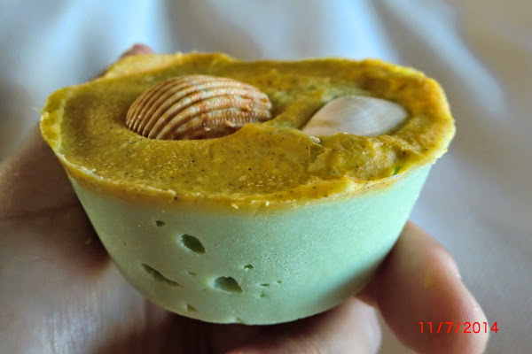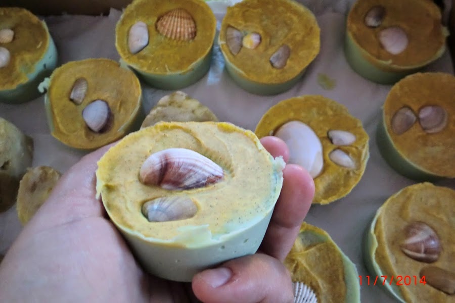Pero el otro... el otro ha quedado casi perfecto a como lo imaginé. Las prisas por el uso de cera de abejas a pesar del calor que hacía ese día, me hicieron temblar y sudar...jejeje... (la cera hace que la masa del jabón se solidifique enseguida y cuesta trabajar con ella a la par que el resultado es un jabón imperfecto con agujeros y tal porque ya no deja salir el aire atrapado) pero al final quedaron bien chulas.