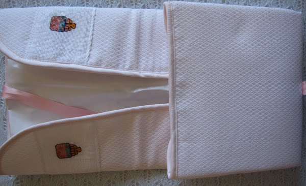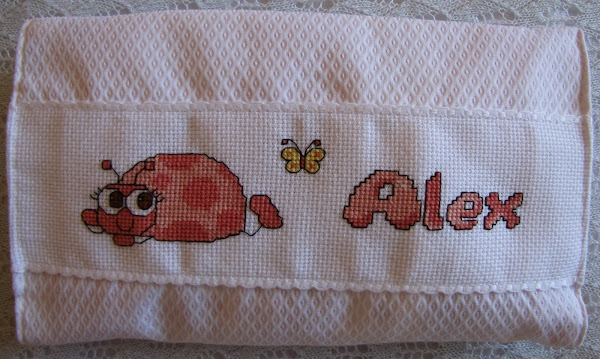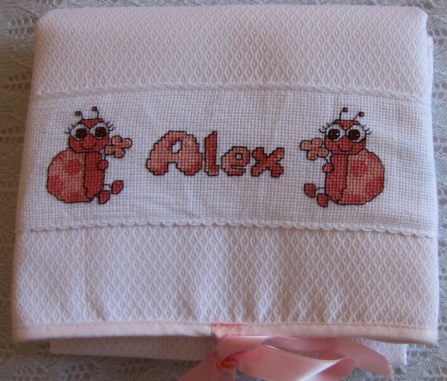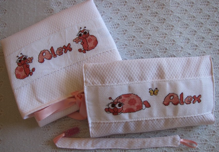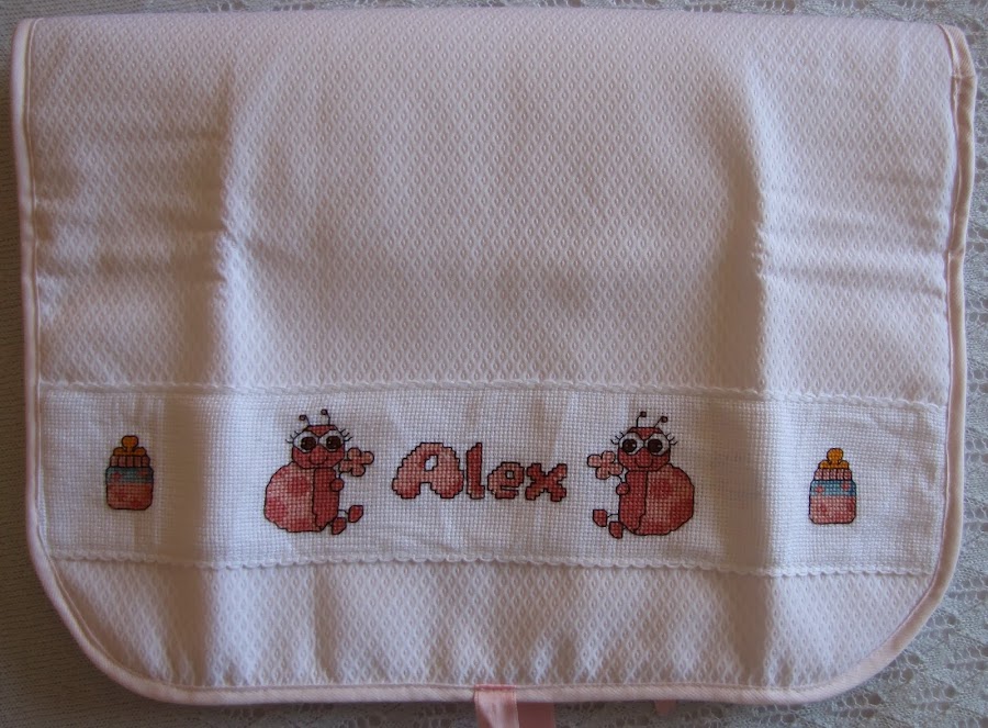 Después de ver lo mucho que gustó el PROYECTO CARLOS tanto a la mamá como a las chicas que me lo encargaron decidí que esté siguiera la misma línea, un cambiador y neceser guardapañales para llevar en la sillita personalizadas con el nombre de Alex, baberos, toallas para las babas y una capa de baño.