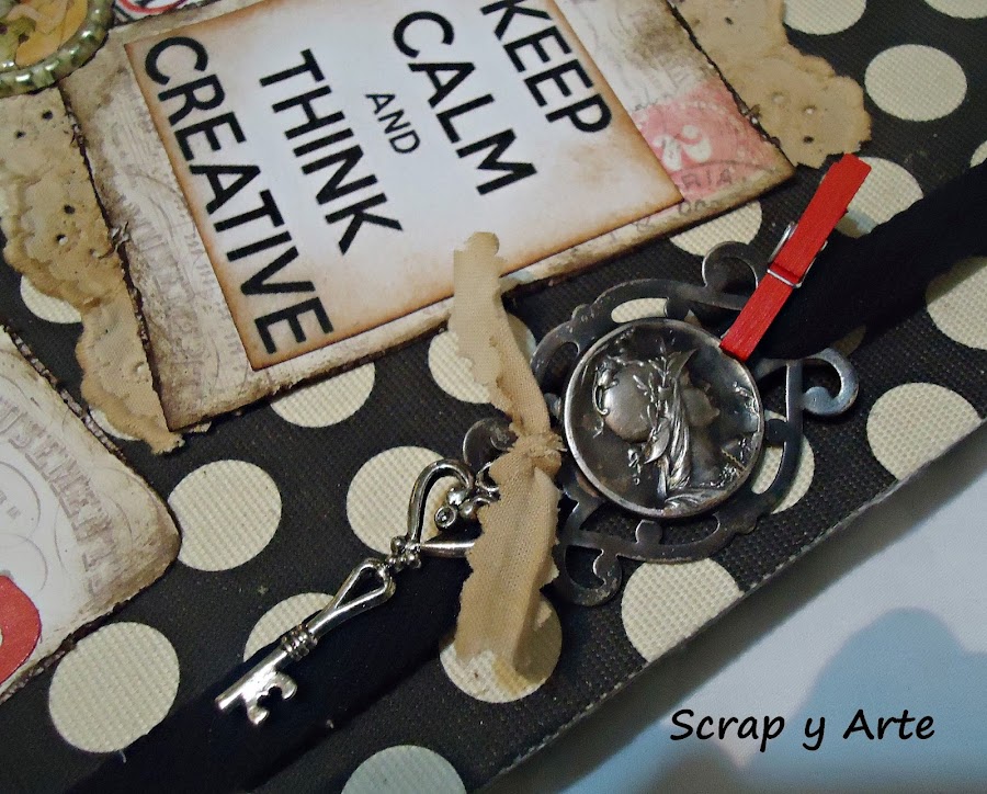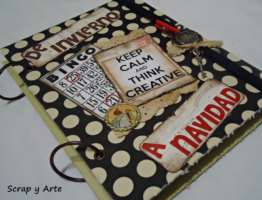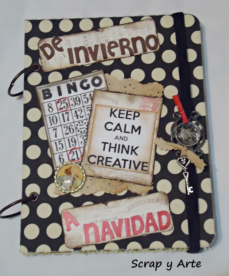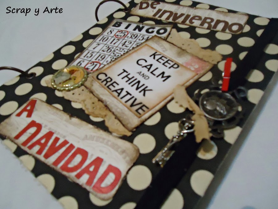 Las letras del titulo de invierno a navidad, están cortadas con la big shot y el cierre del cuaderno es una cinta elástica, con una hebilla antigua (la encontré en la caja de los recuerdos que herede de mi mamá), una llave atada con una tirita de tela y un toque de rojo con un brochecito de madera.