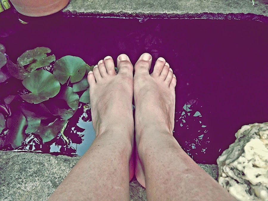 He querido plasmarlo como mejor he podido, y para ello he elegido como fondo el pequeño estanque que tenemos en casa en una pila de piedra que tiene más años que Tutankamon, y mis horribles pies jajaja