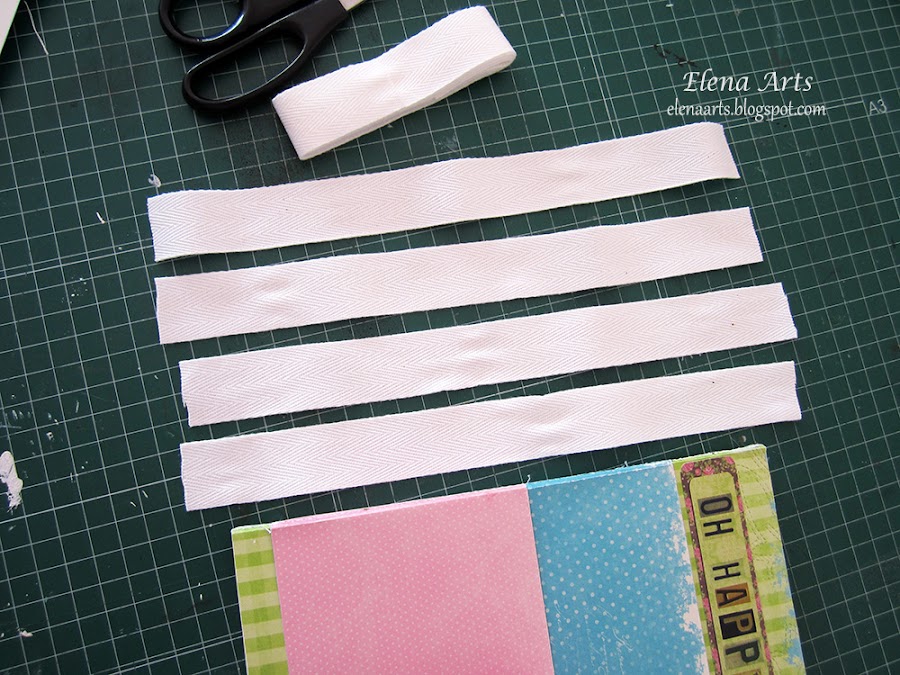 Cortamos 4 tiras de cinta de algodón de largo de nuestro álbum + 1 cm para cada lado. Es decir, si tenemos el largo de álbum 21 cm, pues las tiras serán de 23 cm. También podéis sustituir las tiras por un trozo de tela gruesa, como puede ser un trozo de tela baquera o de lino.