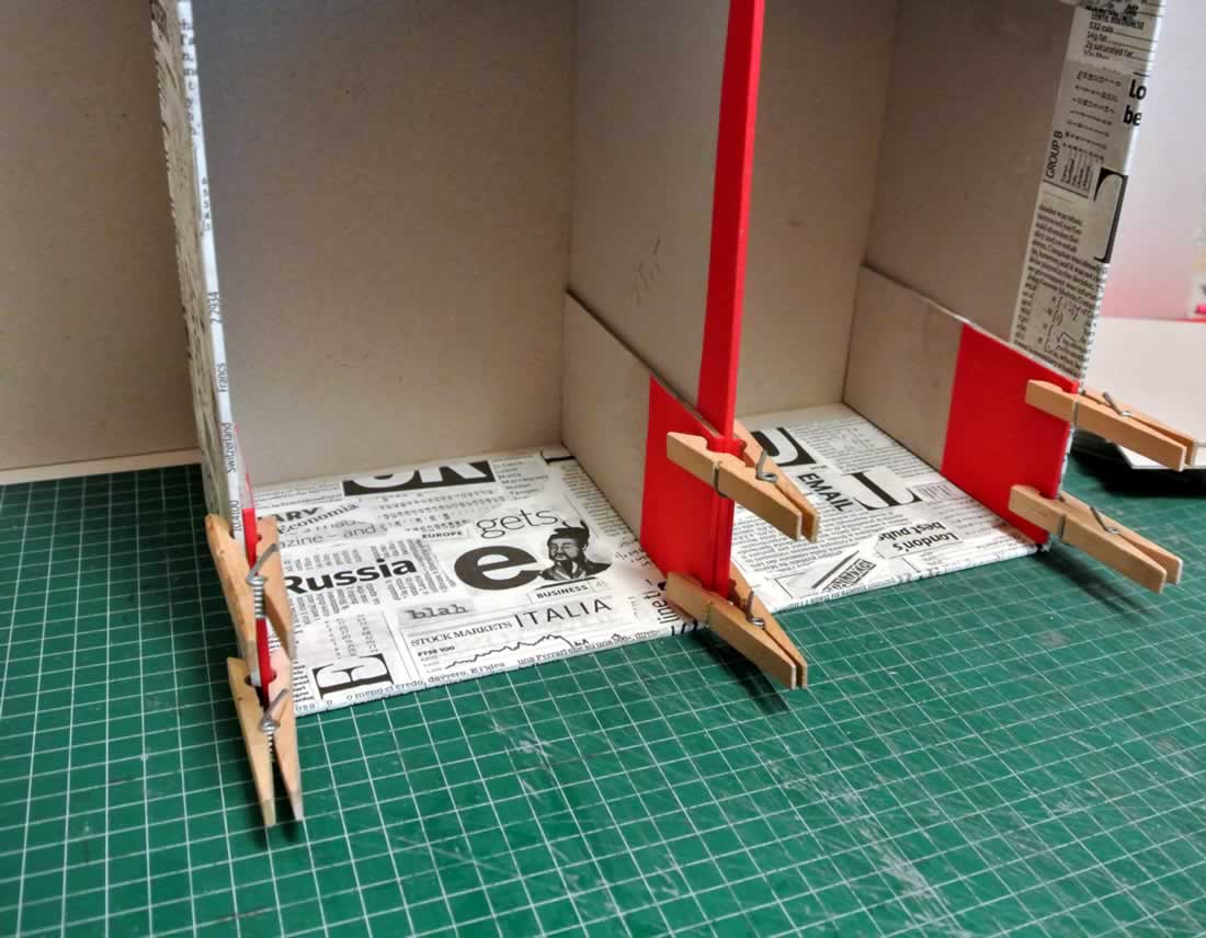 Paso 4. Los vamos pegando en los laterales interiores. Nos podemos ayudar con pinzas para que fijen antes.
