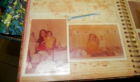 Para las fotos que estaban pegadas en el álbum pues aplíquela técnica recomendada por Patricia Castro, como no tenia pincel lo que hice fue que con un cotonete moje con alcohol y con mucho cuidado moje las esquinas de las fotos una vez levantada las puntas fue fácil retirarla foto porque al parecer estaban pegadas en las puntas nada más.