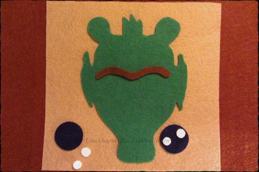 Hacer las rayas a la ceja y luego coser los ojos y la ceja a la cabeza y ya estaría listo para terminar de ponerlo cosido al recuadro.