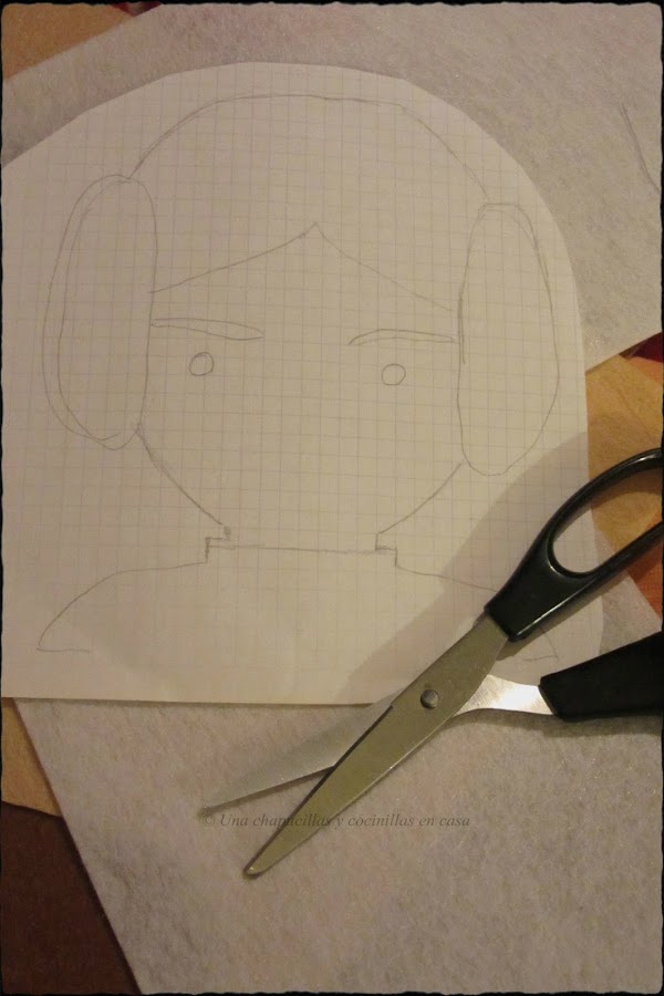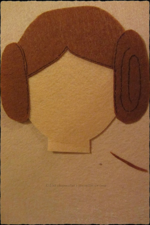 Coser con hilo marrón mas grueso las lineas del pelo y formar una espiral en los moños.