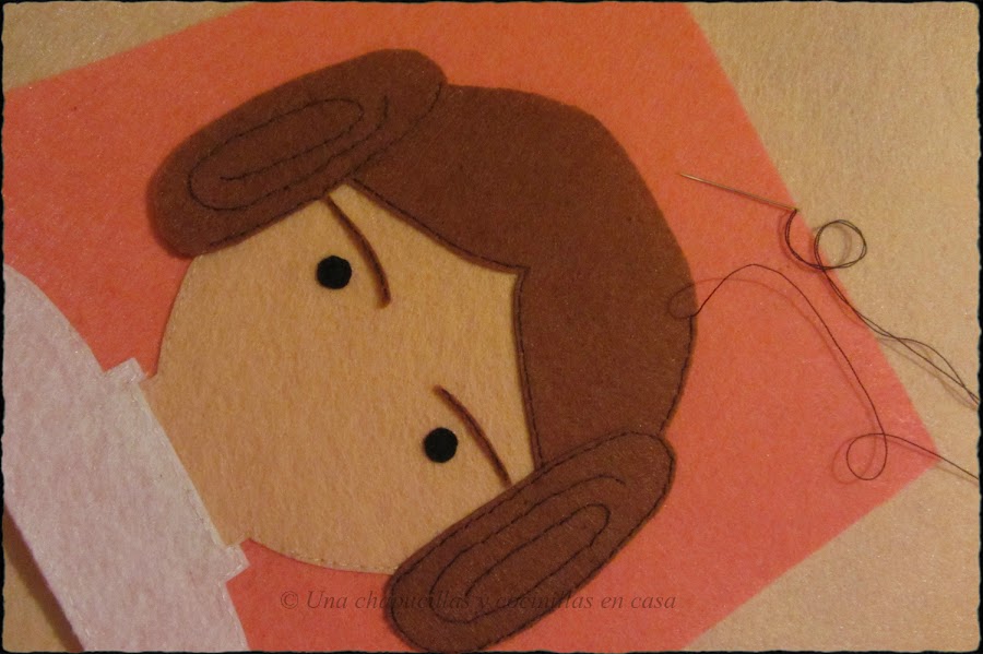 Coser los ojos, cejas y terminar cosiéndolo todo al recuadro.