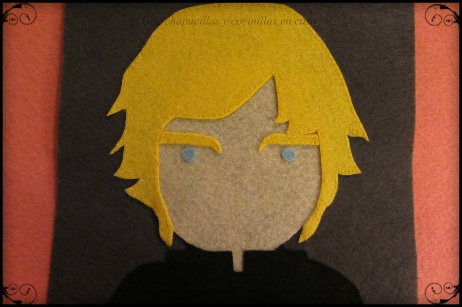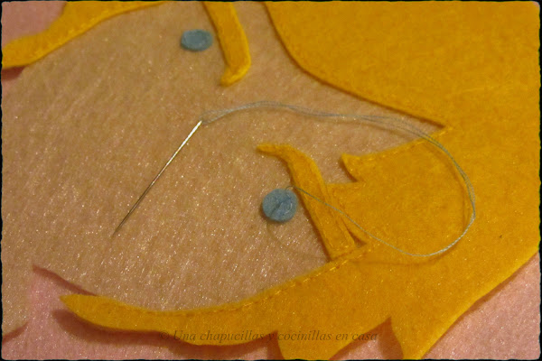Recortar en fieltro los rasgos mas marcados: ojos, nariz y boca y sujetarlos con alfileres a la hora de coser, luego ya el resto de detalles como las arrugas con hijo de perlé negro.
