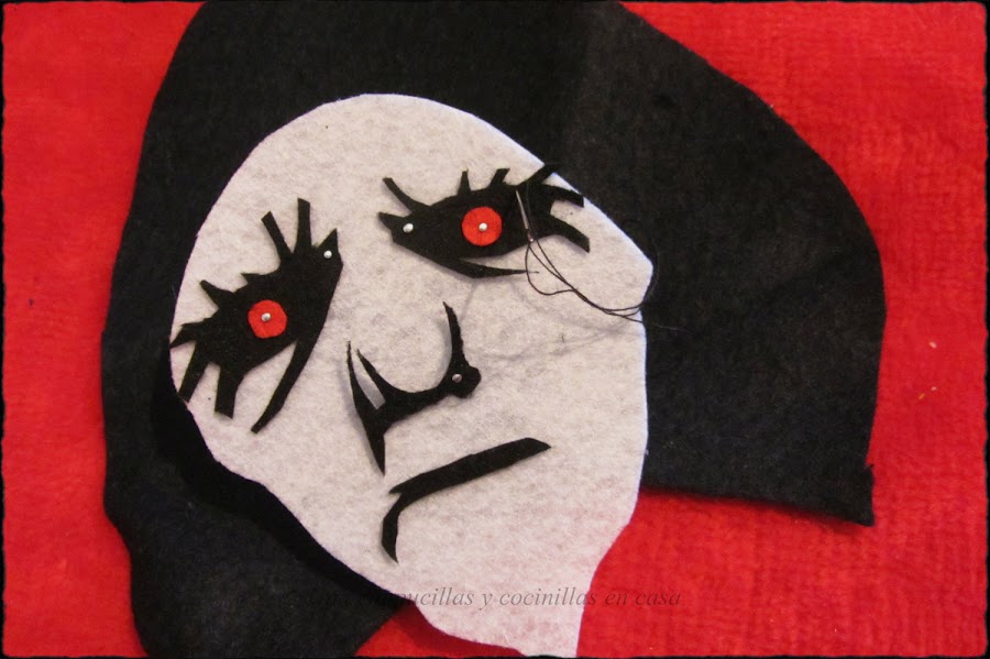 Coser luego la cara a la capucha, recortar una tira de fieltro gris y coserlo al borde, para darle mas realismo a la misma.