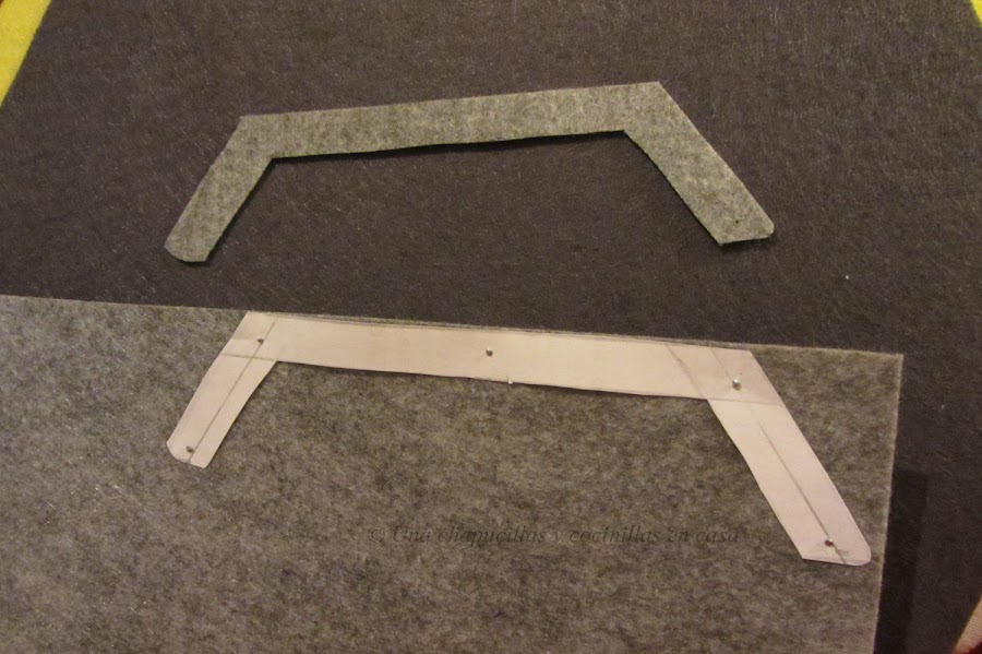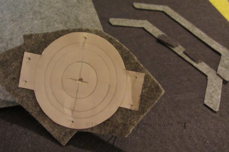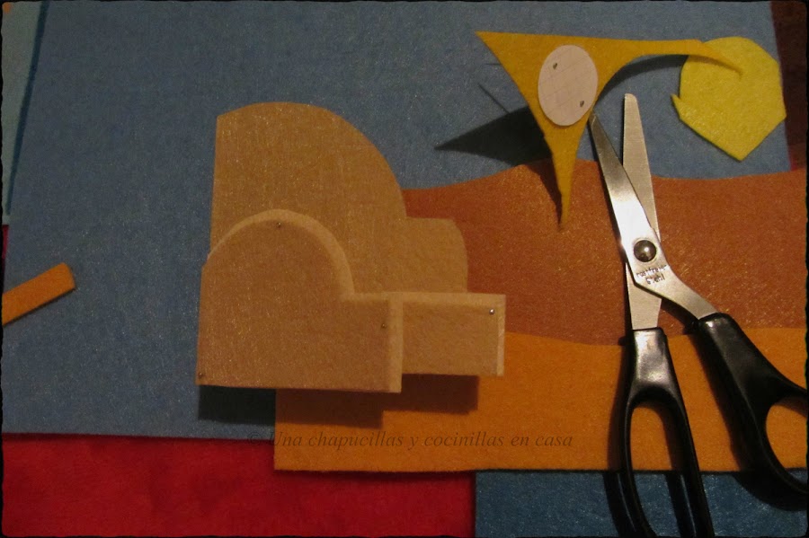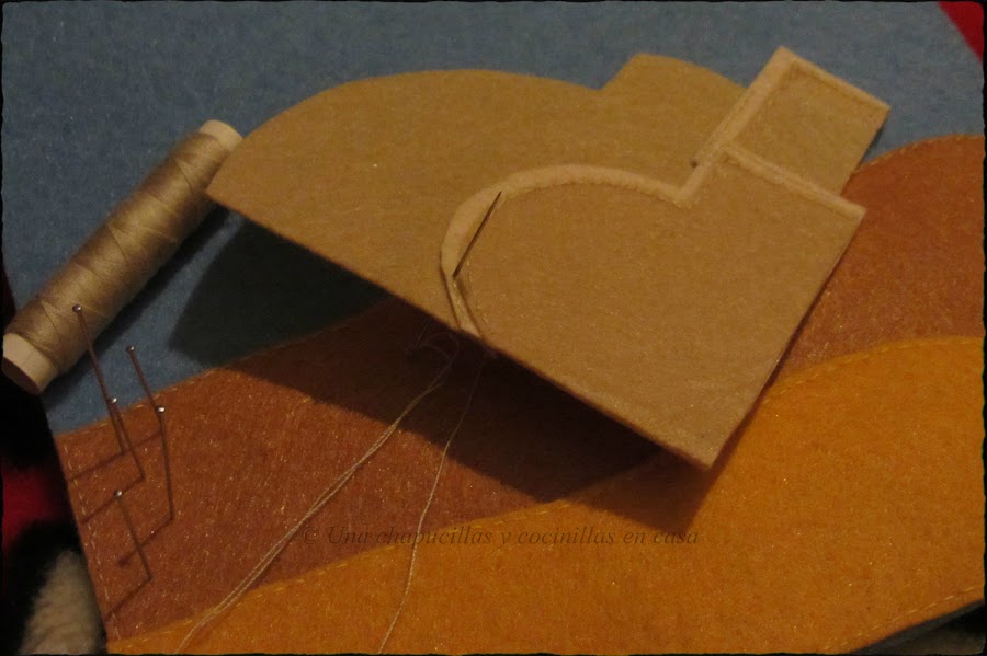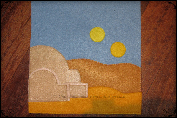 Dibujar en papel la silueta de la vivienda de Luke, recortar en fieltro, yo use dos tonos de beige.