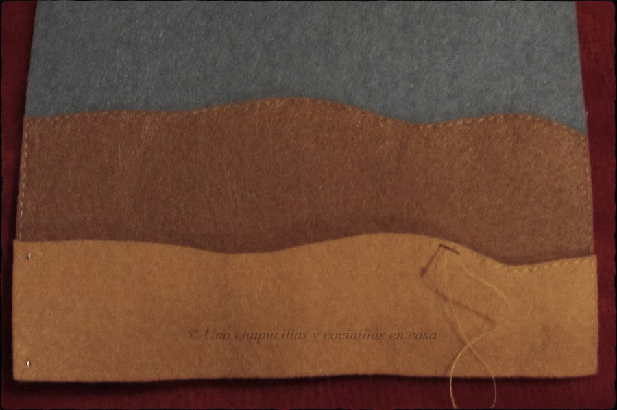 La base del cuadro es azul, así que recortar en dos tonos de marrón las dunas y coserlas superponiendo una sobre otra.