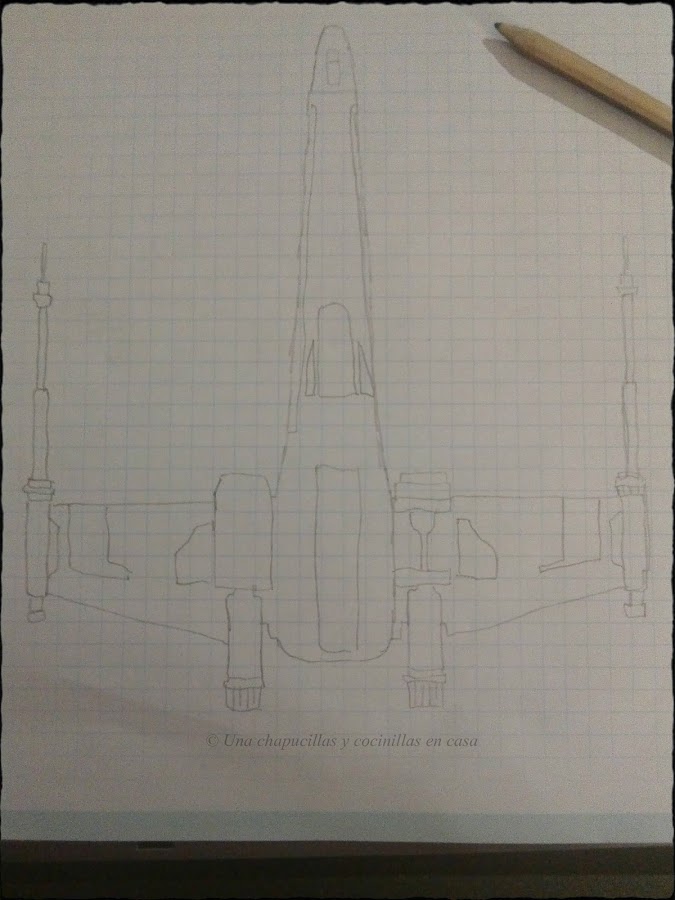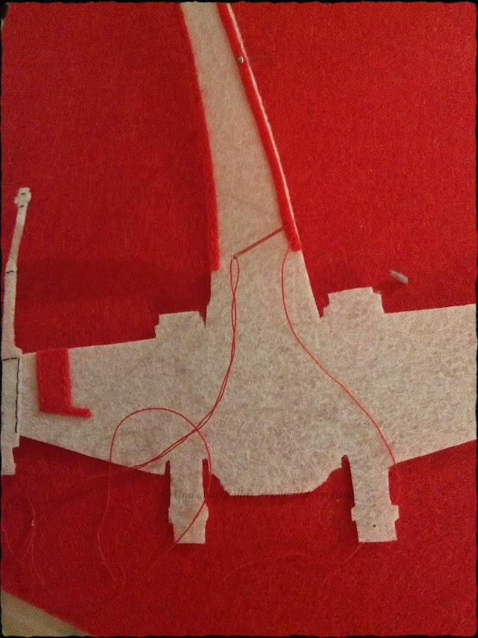 Vamos con el recuadro difícil. Dibujarlo en papel y recortar las pequeñas partes, son pequeñas para hacer mas realista la nave y cuesta mas coserlas.