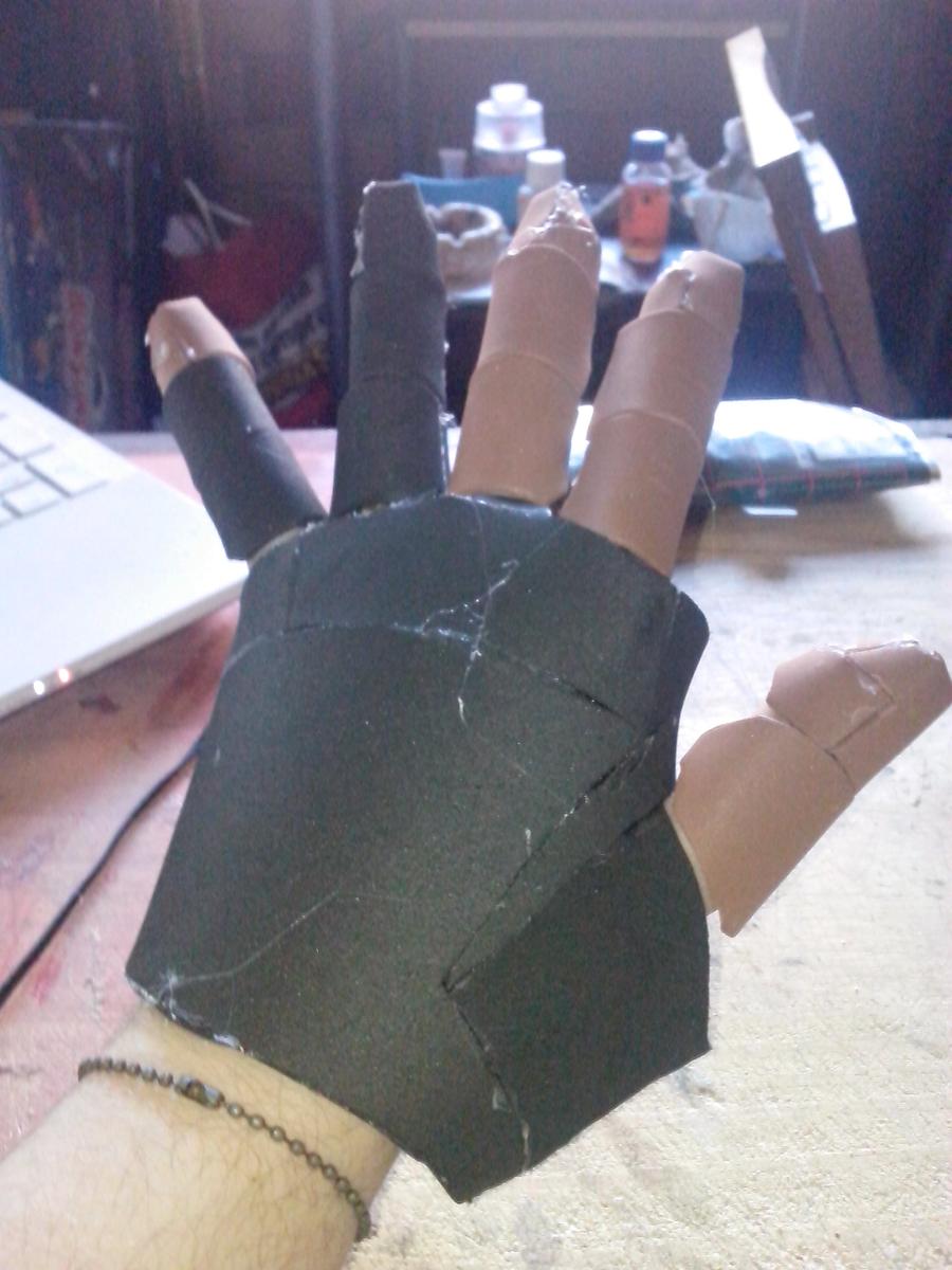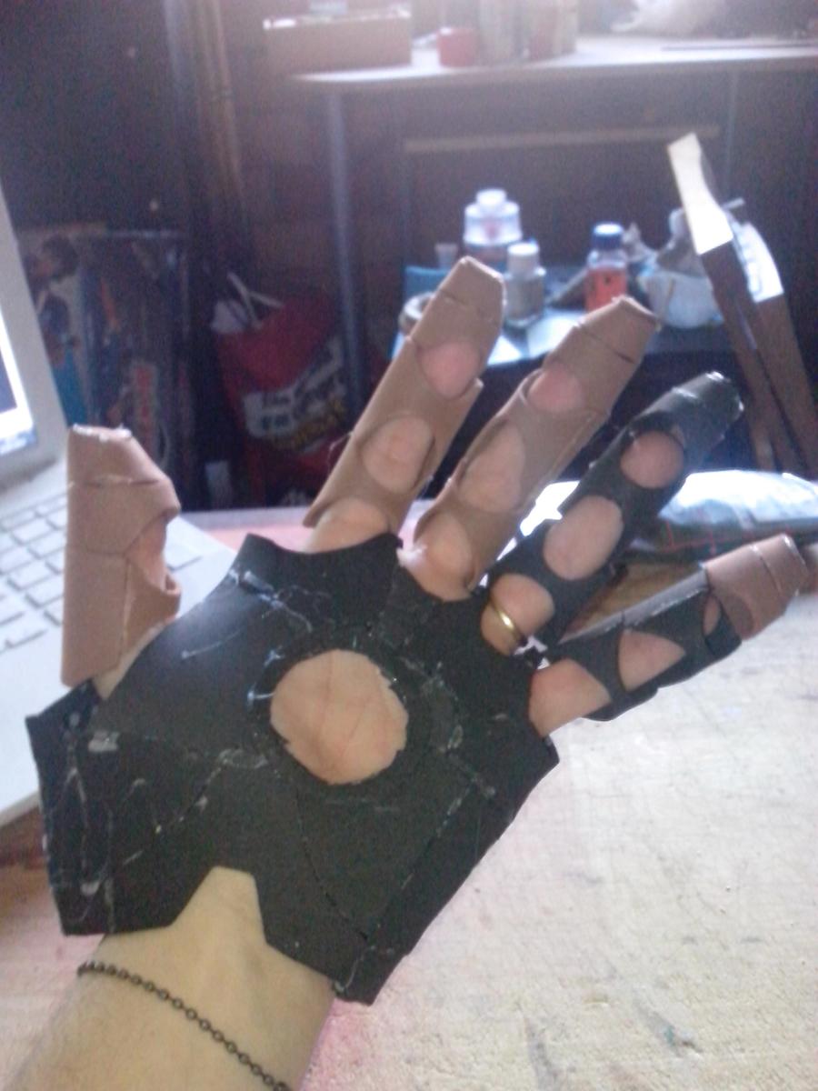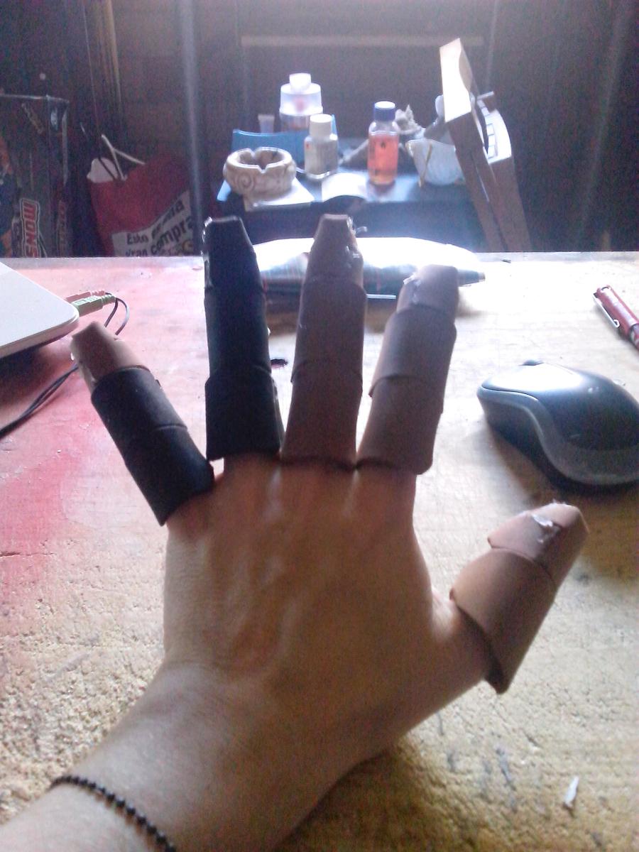 Nótese que he utilizado unos pequeños trozos de foam para unir los dedos temporalmente. Eso les resta peso, los cables de acero aumentaban muchísimo el peso de la mano y raspaban a la hora de meter los dedos.