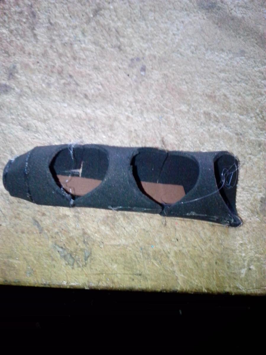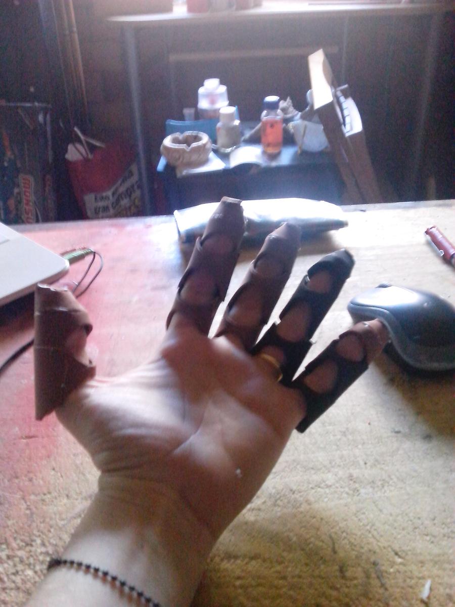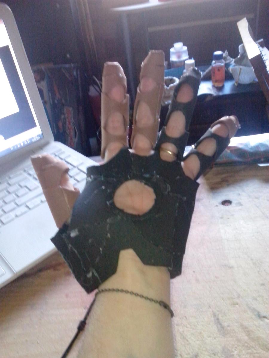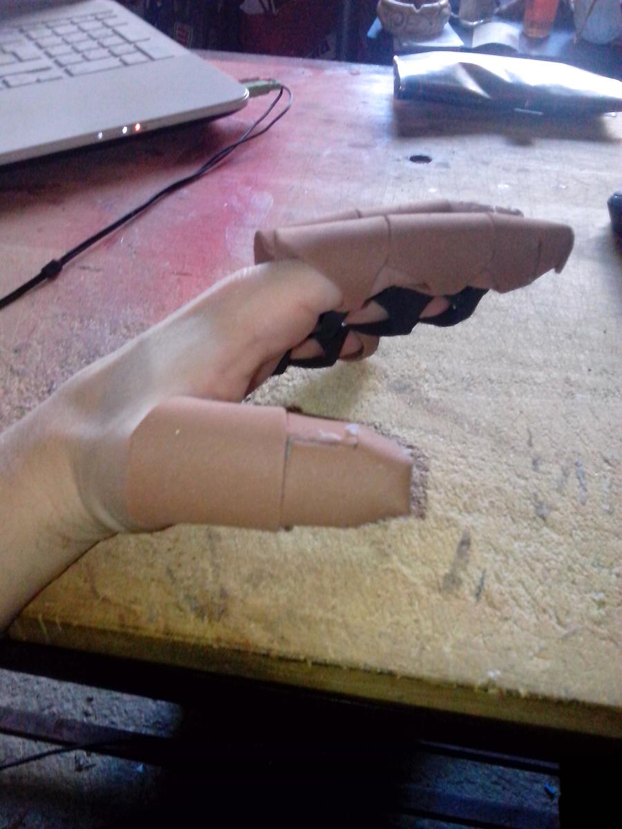 Nótese que he utilizado unos pequeños trozos de foam para unir los dedos temporalmente. Eso les resta peso, los cables de acero aumentaban muchísimo el peso de la mano y raspaban a la hora de meter los dedos.