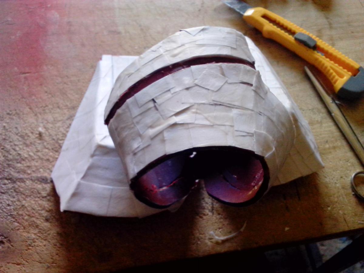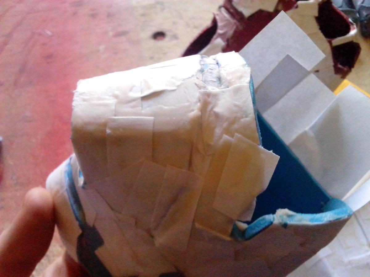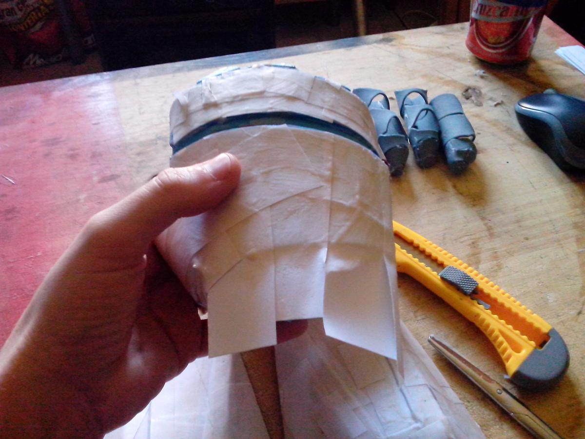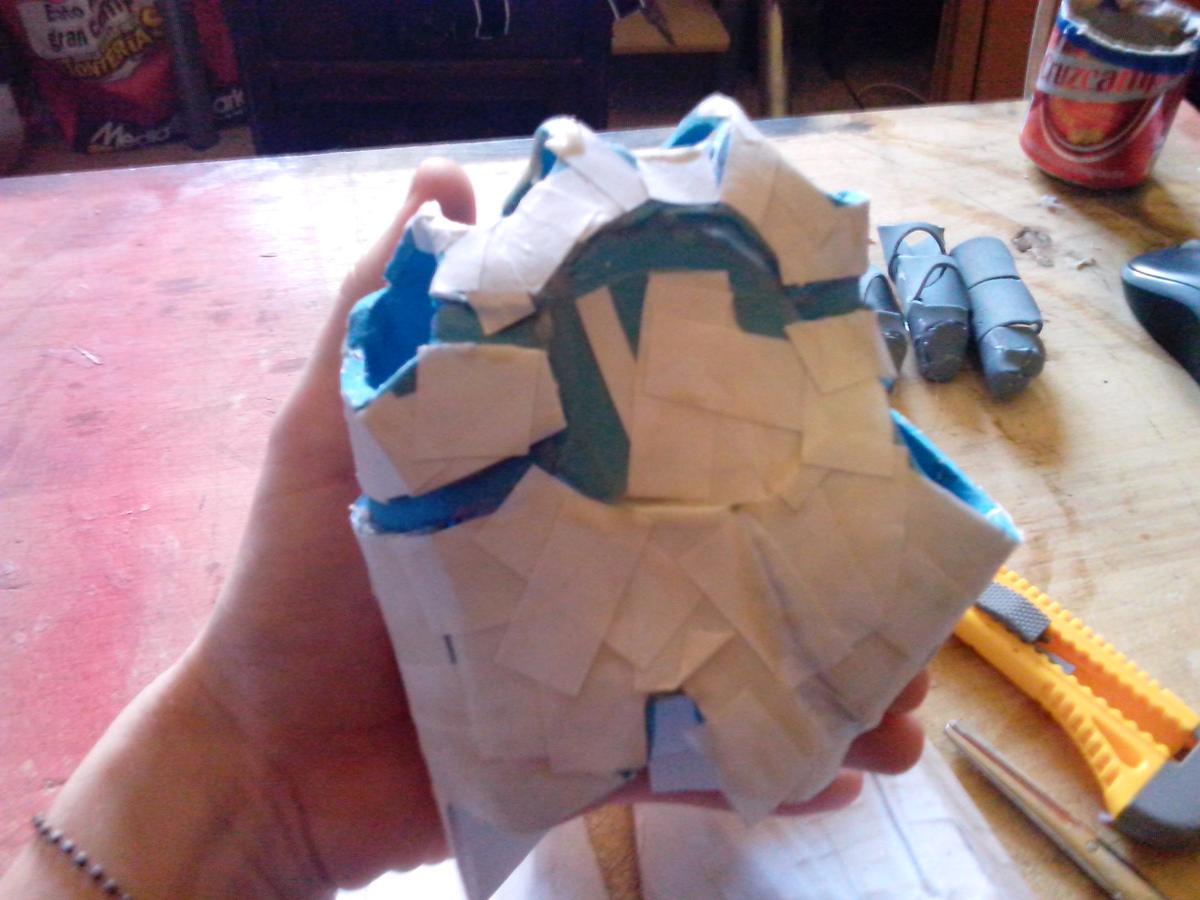 Piezas separadas, dedos embadurnados de cola blanca (es un proceso bastante sucio), sólo queda comenzar a poner papelitos. Recordad que, según vais poniendo papeles, la armadura tiene diferencias de altura, detallitos, debéis tenerlo en cuenta. Con la uña (ya tenéis las manos llenas de cola, qué más da), o con un palito metálico o algo suave pero consistente, apretad los trozos de papel bien para hacer esos “escalones”.