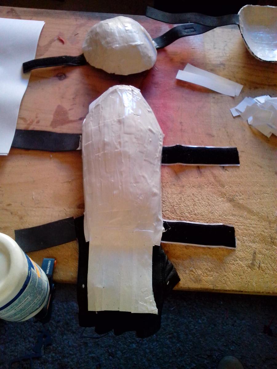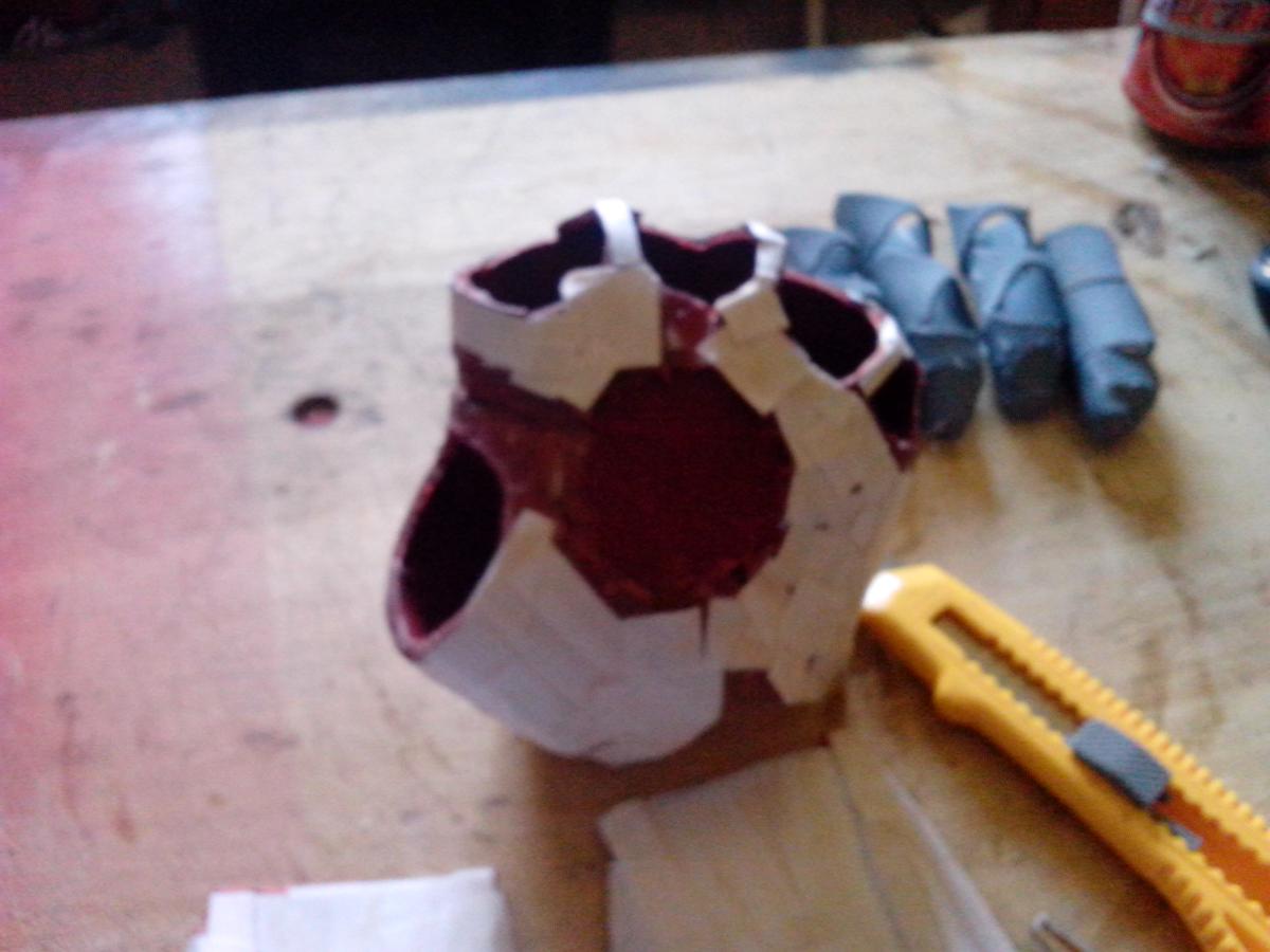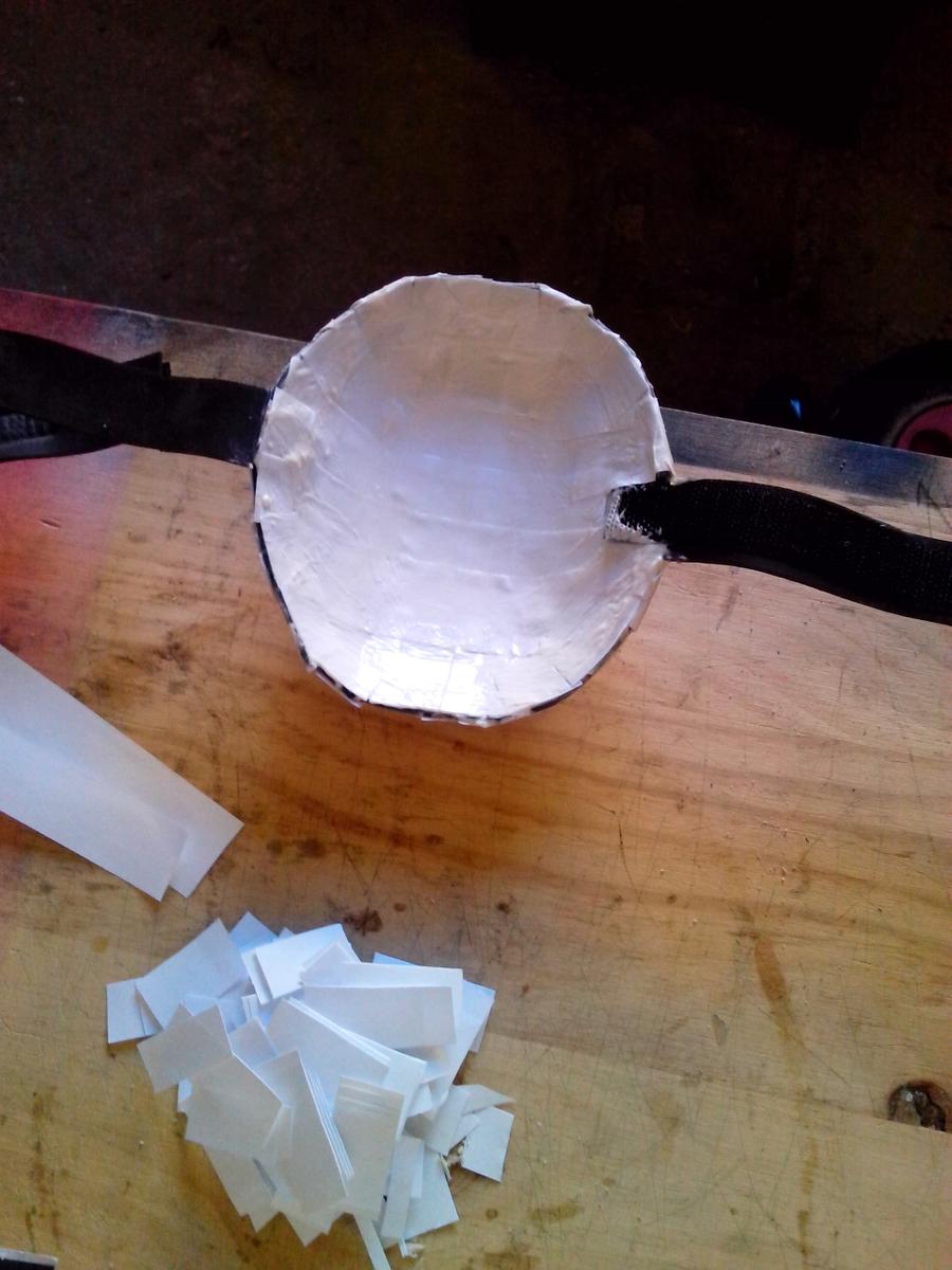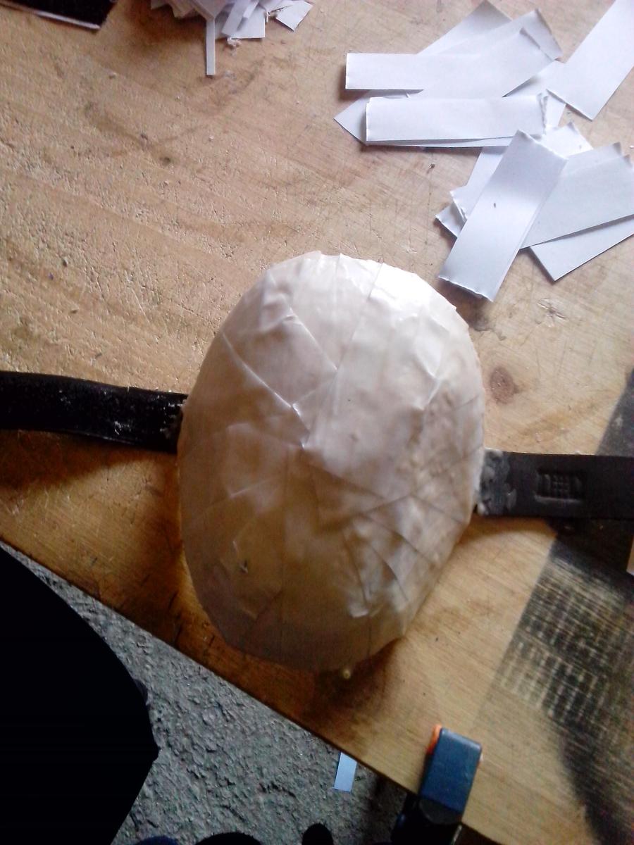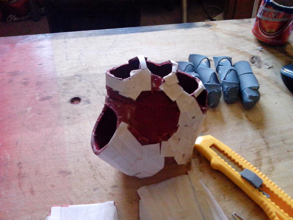 Piezas separadas, dedos embadurnados de cola blanca (es un proceso bastante sucio), sólo queda comenzar a poner papelitos. Recordad que, según vais poniendo papeles, la armadura tiene diferencias de altura, detallitos, debéis tenerlo en cuenta. Con la uña (ya tenéis las manos llenas de cola, qué más da), o con un palito metálico o algo suave pero consistente, apretad los trozos de papel bien para hacer esos “escalones”.