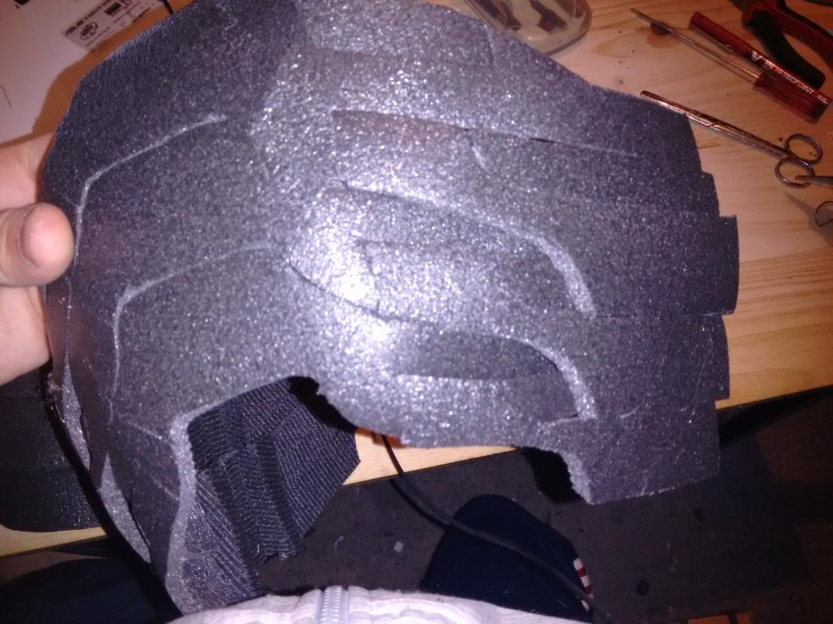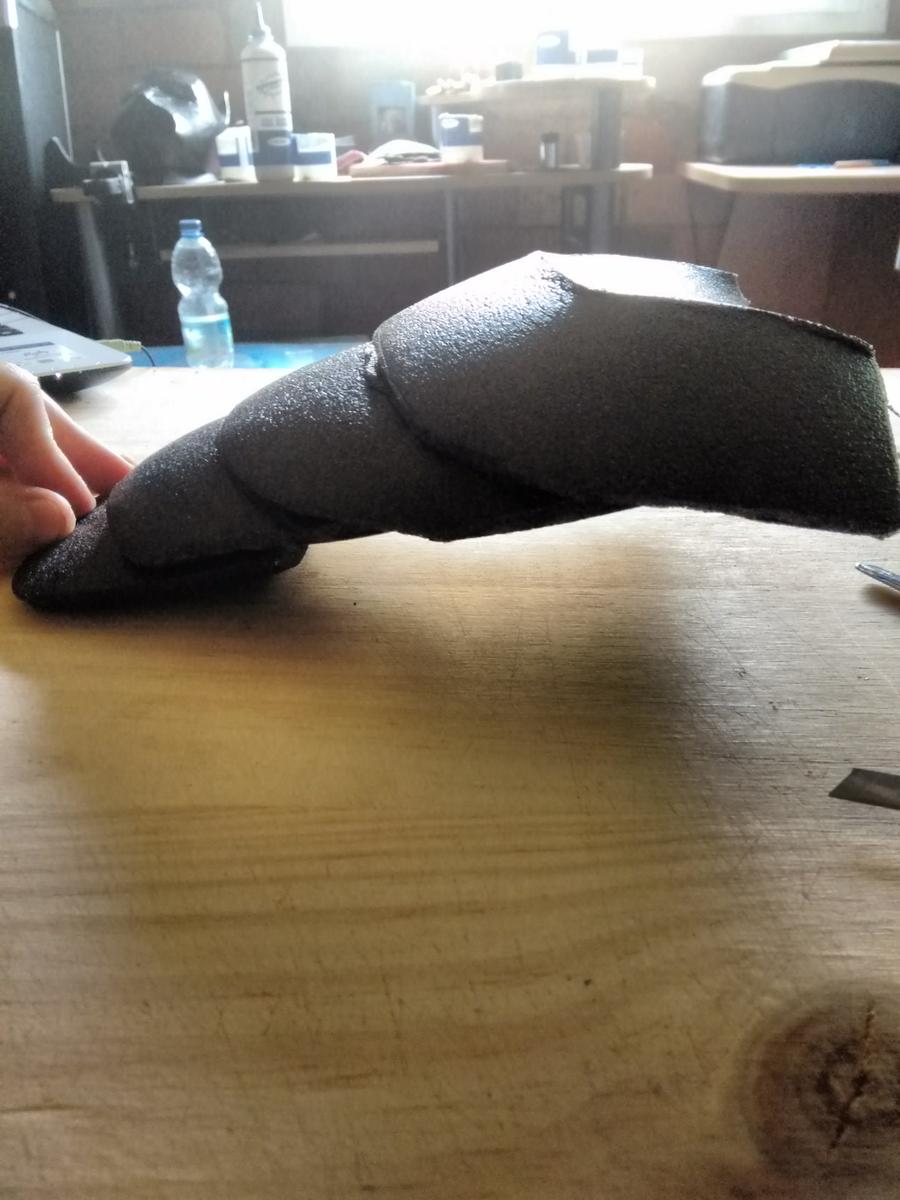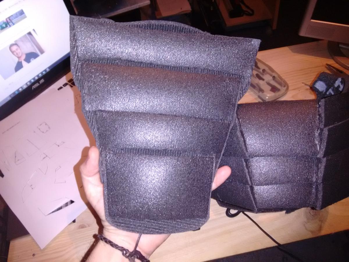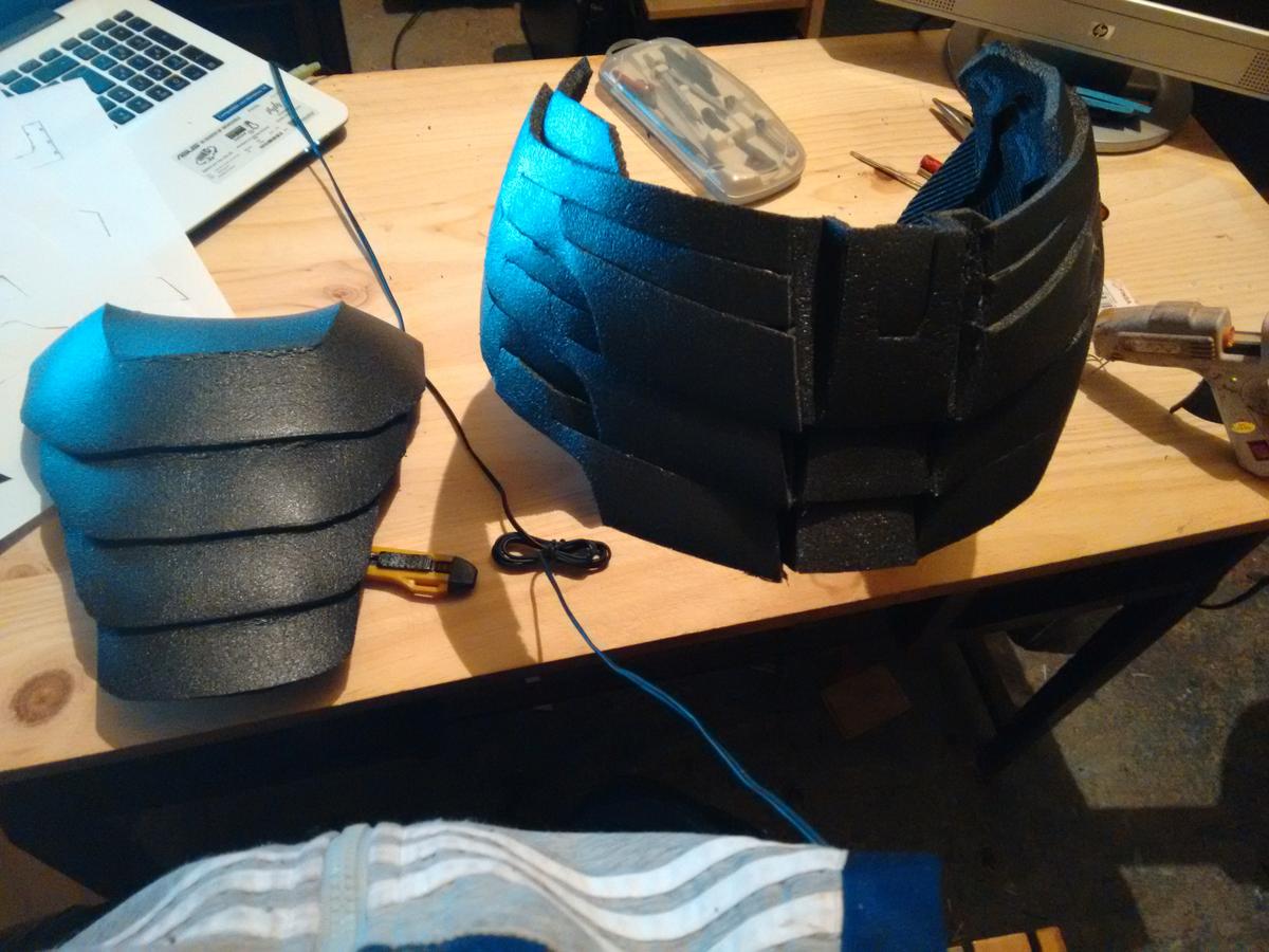 Con todo esto ya terminado, sólo tendré que hacer peto y espalda, ambos brazos desde el antebrazo al hombro y luego el cuello y el casco. El cuello lo voy a hacer de nuevo porque he encontrado unos planos que me vendrán muy bien porque es mucho más realista, al igual que la espina dorsal que va pegada a la espalda. Finalmente el casco irá con el mismo foam con el que lo estoy preparando todo.