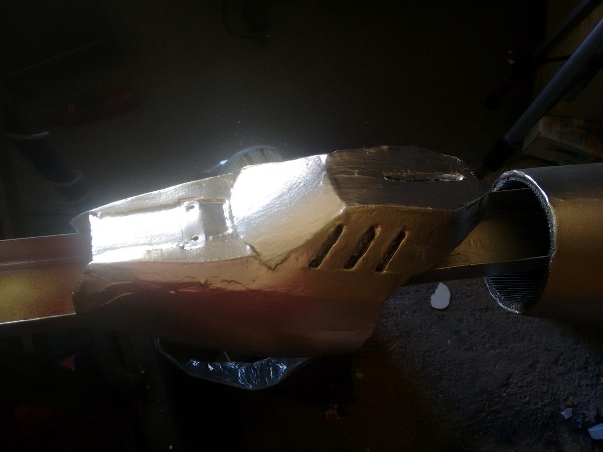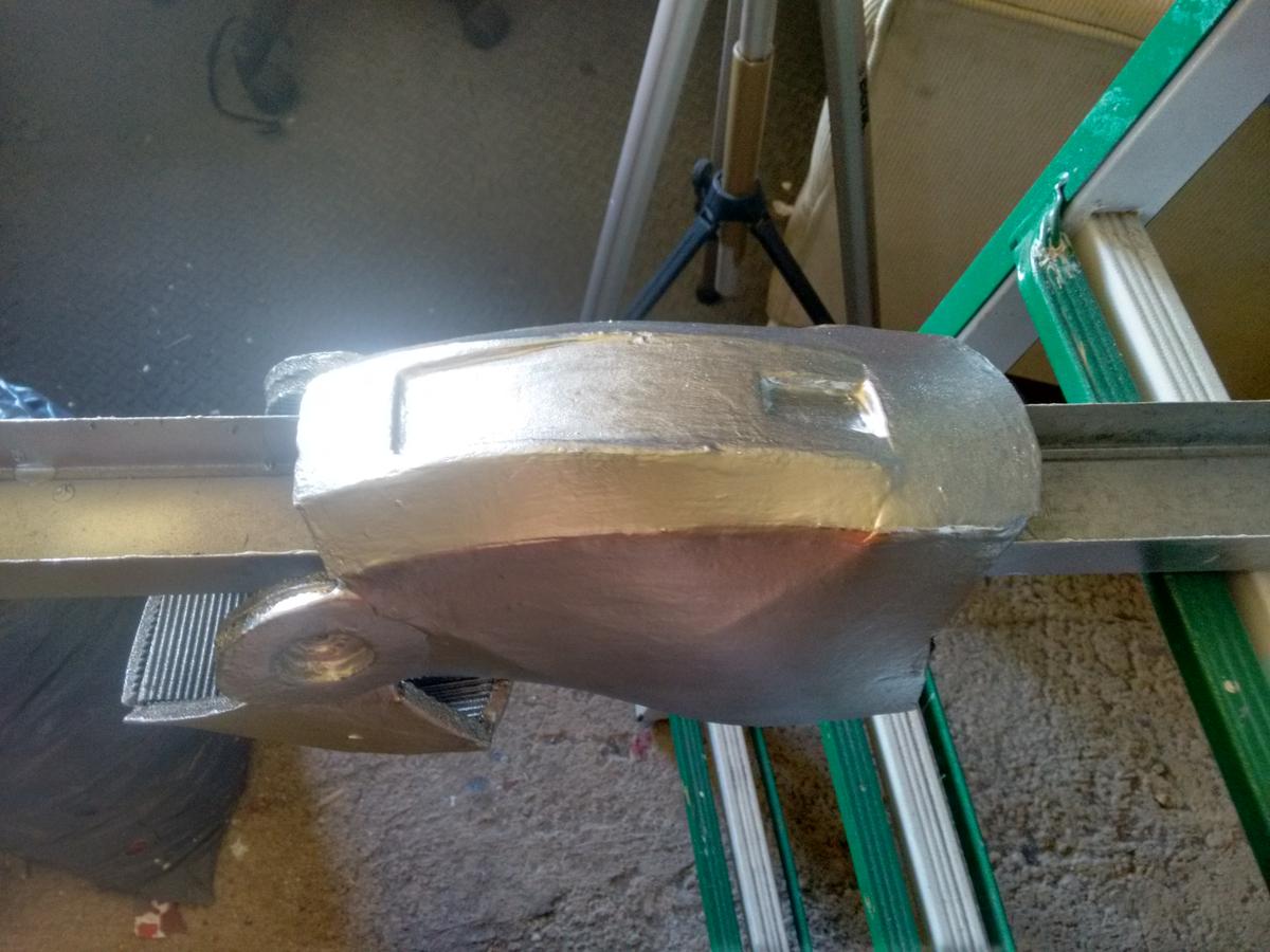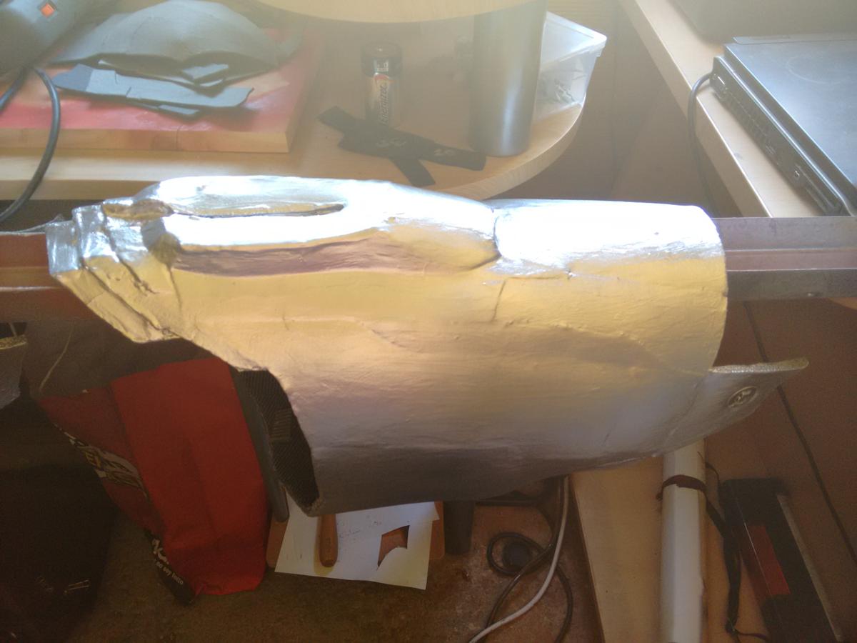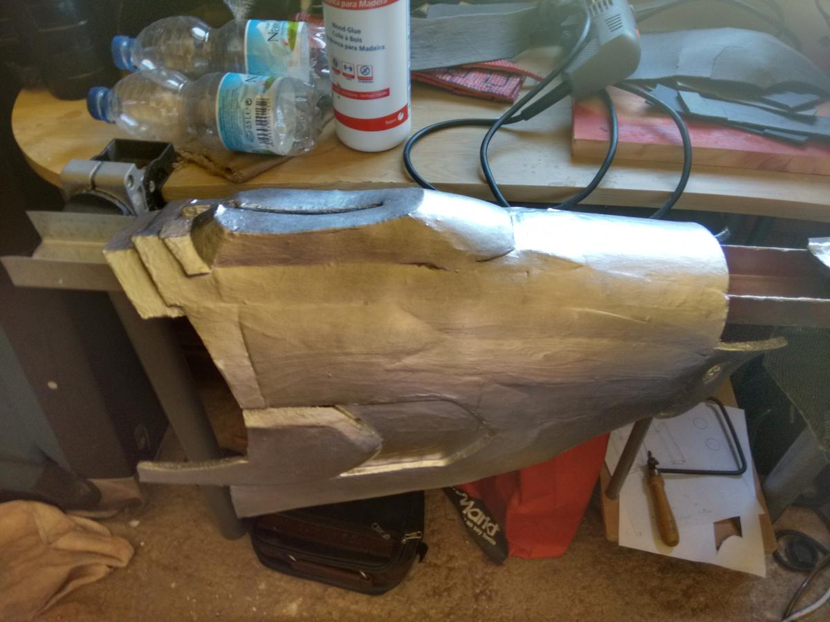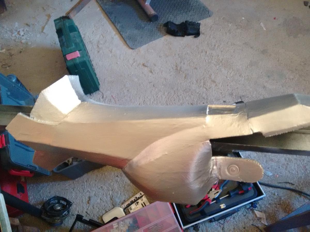 He hecho las botas, espinillas, muslos, antebrazo superior izquierdo, bíceps izquierdo, codo izquierdo y parte del antebrazo inferior izquierdo. No ha estado mal, calculo que con dos o tres botes más tendré la armadura pintada del todo con la capa base y podré dejar parte de los muslos en ese color, junto con las plaquitas que hay en los hombros.