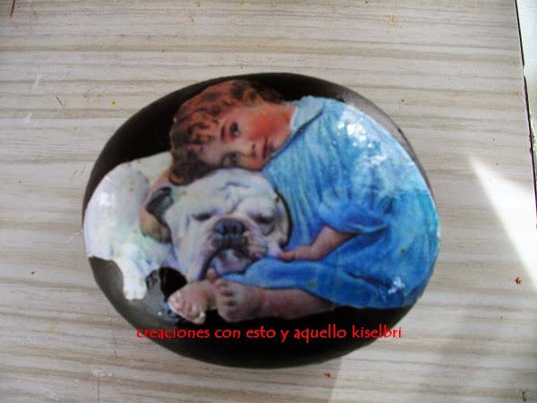 Y una piedra lisa pintada de negro con una figura sobre ella y con barniz para proteger.