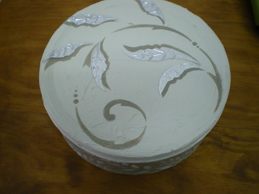 Os presento la lata de galletas... decorado con decoupage, stencil y unas hojitas plateadas!!