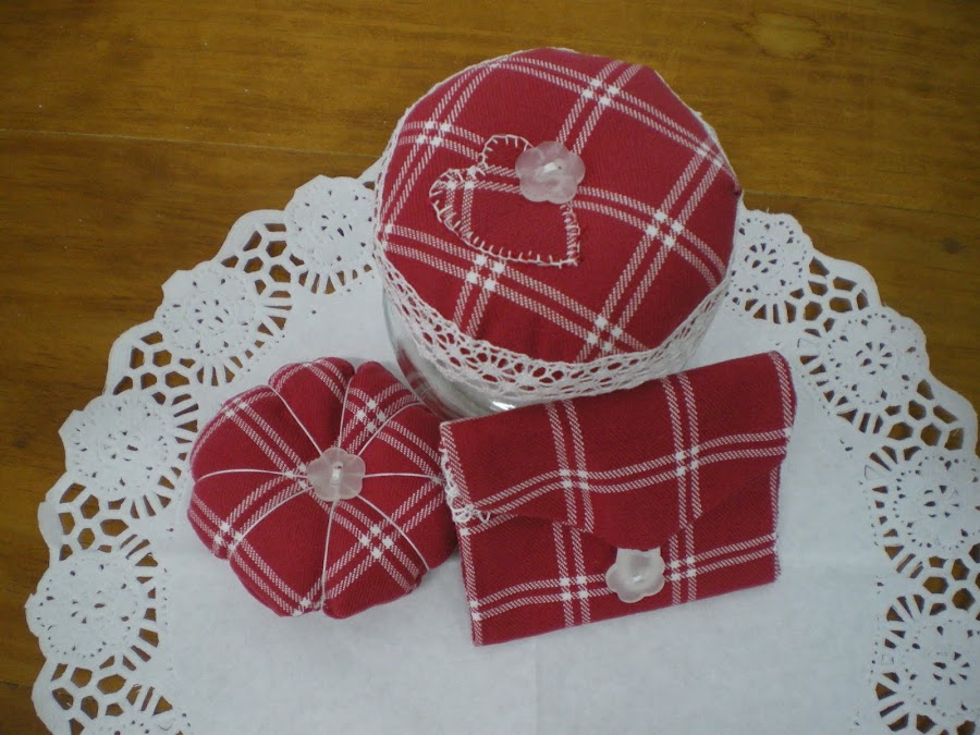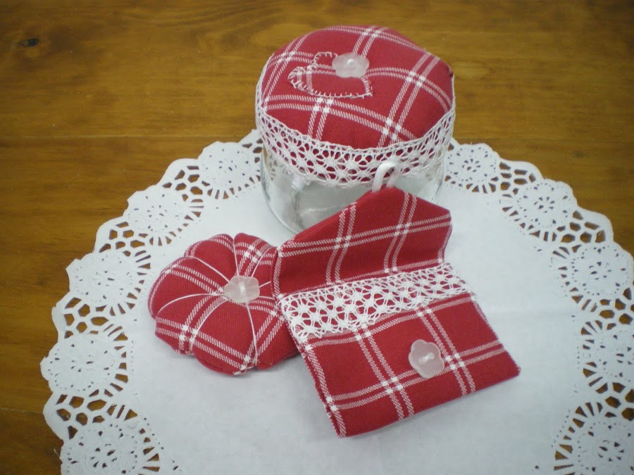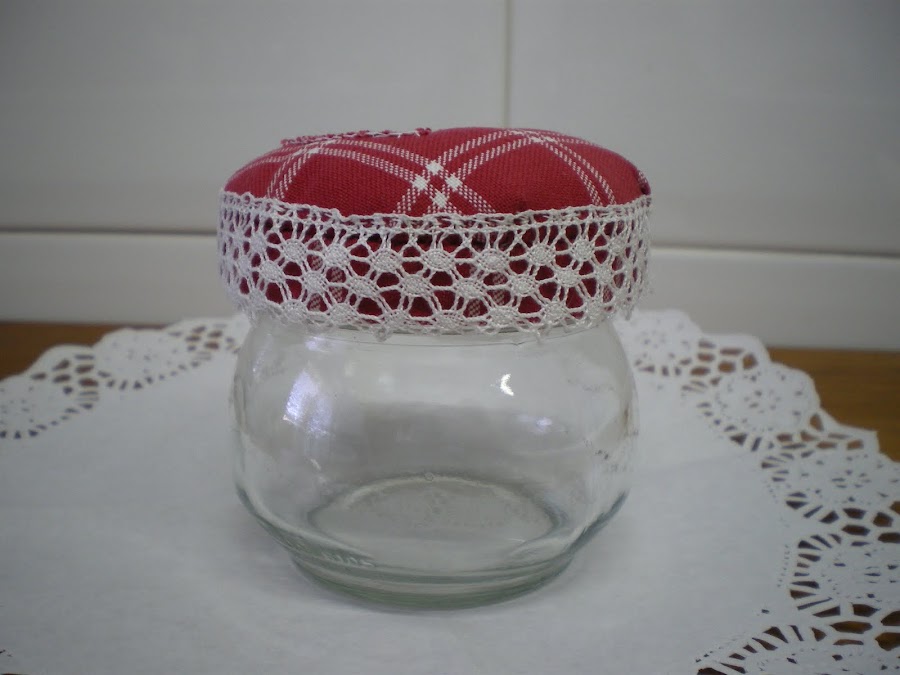 Al final... le hice este botecito guardabotones, con un bote de bocadelia... (sabor cangrejo, para los más curiosos) y... como iba la cosa de reciclaje.. con los retalines de tela que quedaron... un guardadedales y un alfiletero...