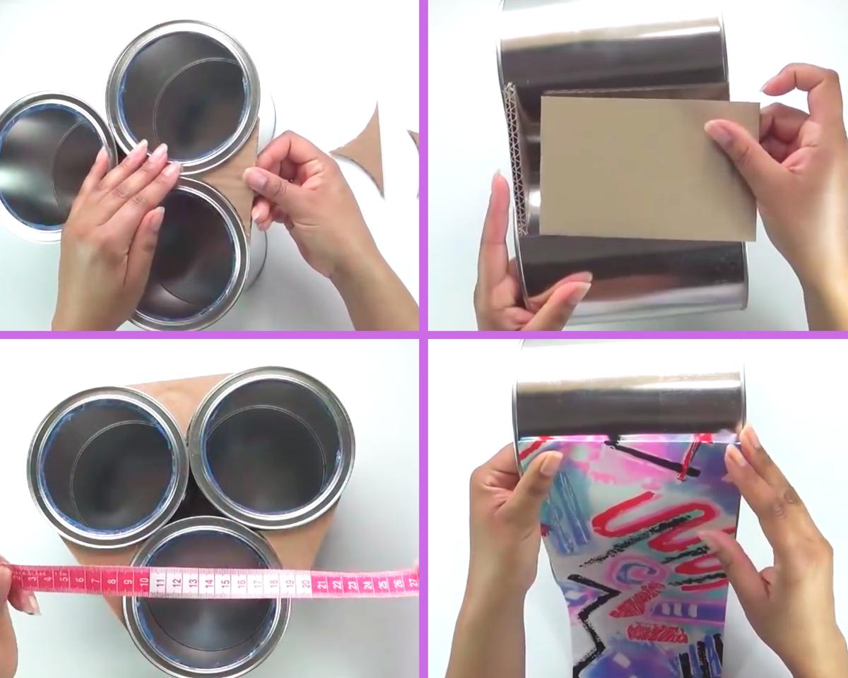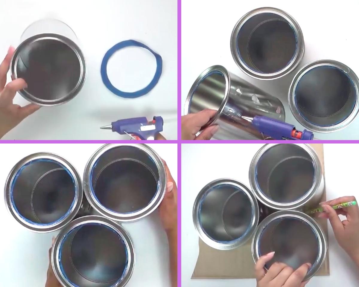 Con bastante silicona pega las 3 latas entre sí.