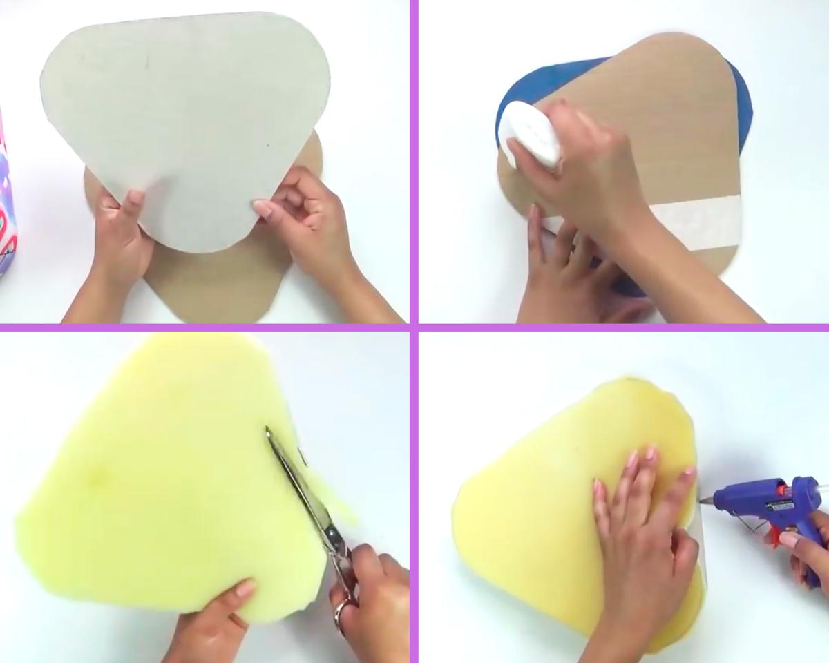 Con la cinta métrica mide el contorno y la altura de toda la pieza y recorta un trozo de foamy (o haz como yo, que forré cajas de cereales con tela) y pégalo forrando el puff.