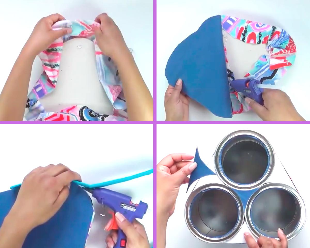 Con fieltro termina de forrar la parte superior de las latas, donde pusimos las piezas de cartón (en la parte central rellené con papel periódico y luego lo forré)